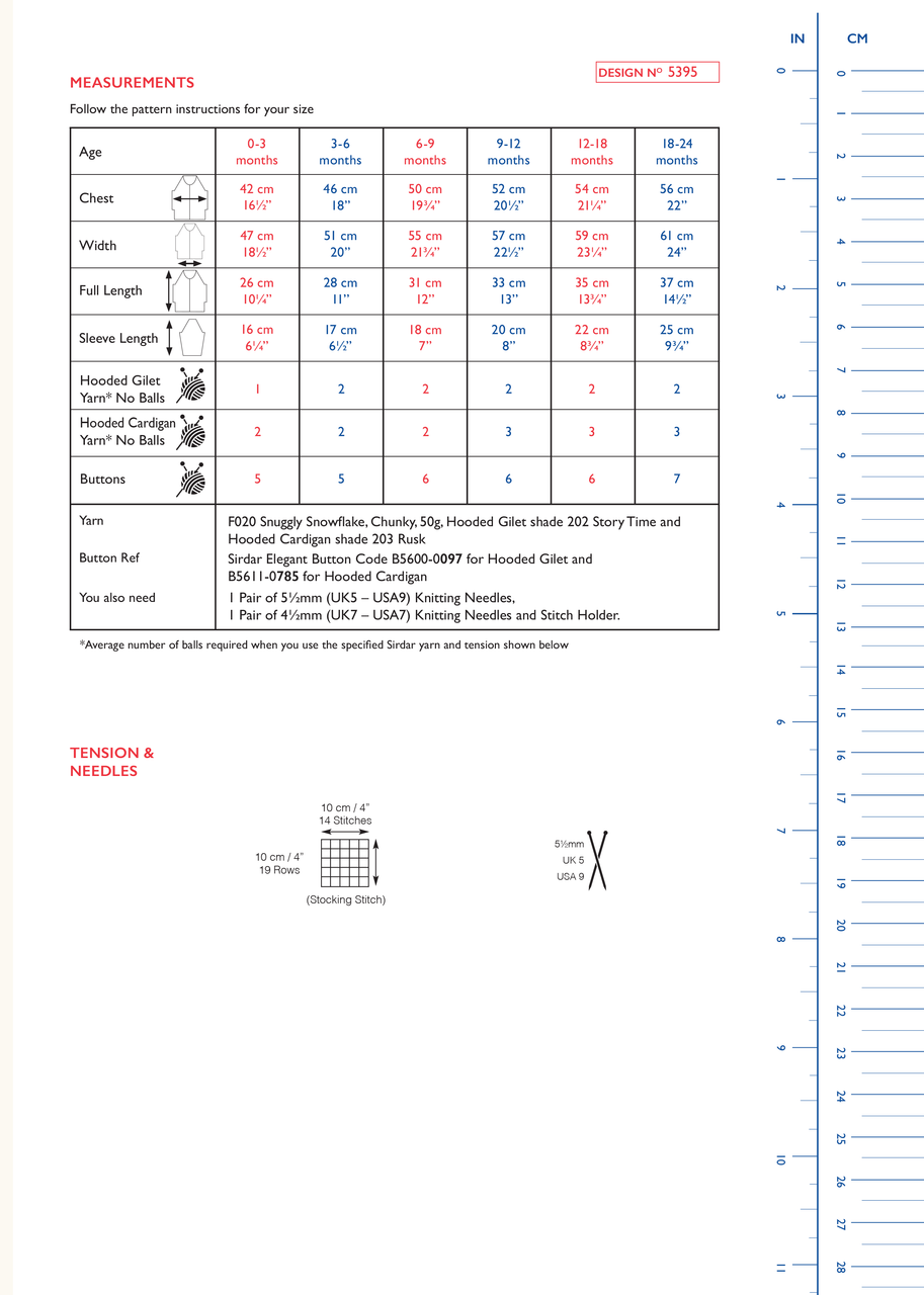 1 Pair of 5½mm (UK5 – USA9) Knitting Needles, 1 Pair of 4½mm (UK7 – USA7) Knitting Needles and Stitch Holder. 5 [5:6:6:6:7] buttons.
