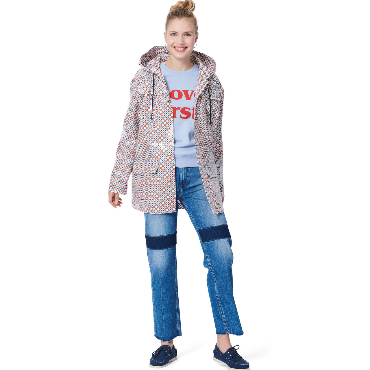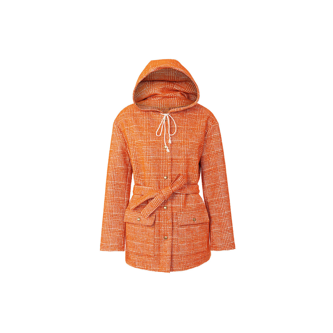 The hooded parkas with patch pockets have clean lines and are minimal in style. There is no lining so they are quick to sew in two different lengths. All are fastened with hammer-on snaps. Jacket B also features a tie belt.