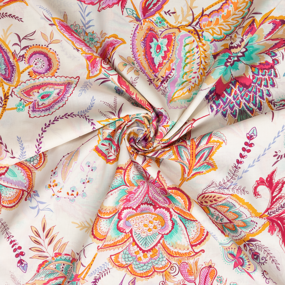 Feel like royalty on the riviera while wearing this Italian 100% Cotton Lawn w/Large Floral on Ivory! Here we have a garden of blooming peonies in multi tones on a ivory background. Perfect for warm seasons, this airy cotton lawn is soft with a flowy drape. Convert this dreamy work of art into short sleeve shirts, sun dresses, full skirts, beach cover-ups, and scarves! Since the textile has a plain weave that is highly translucent, a lining is encouraged for most projects.