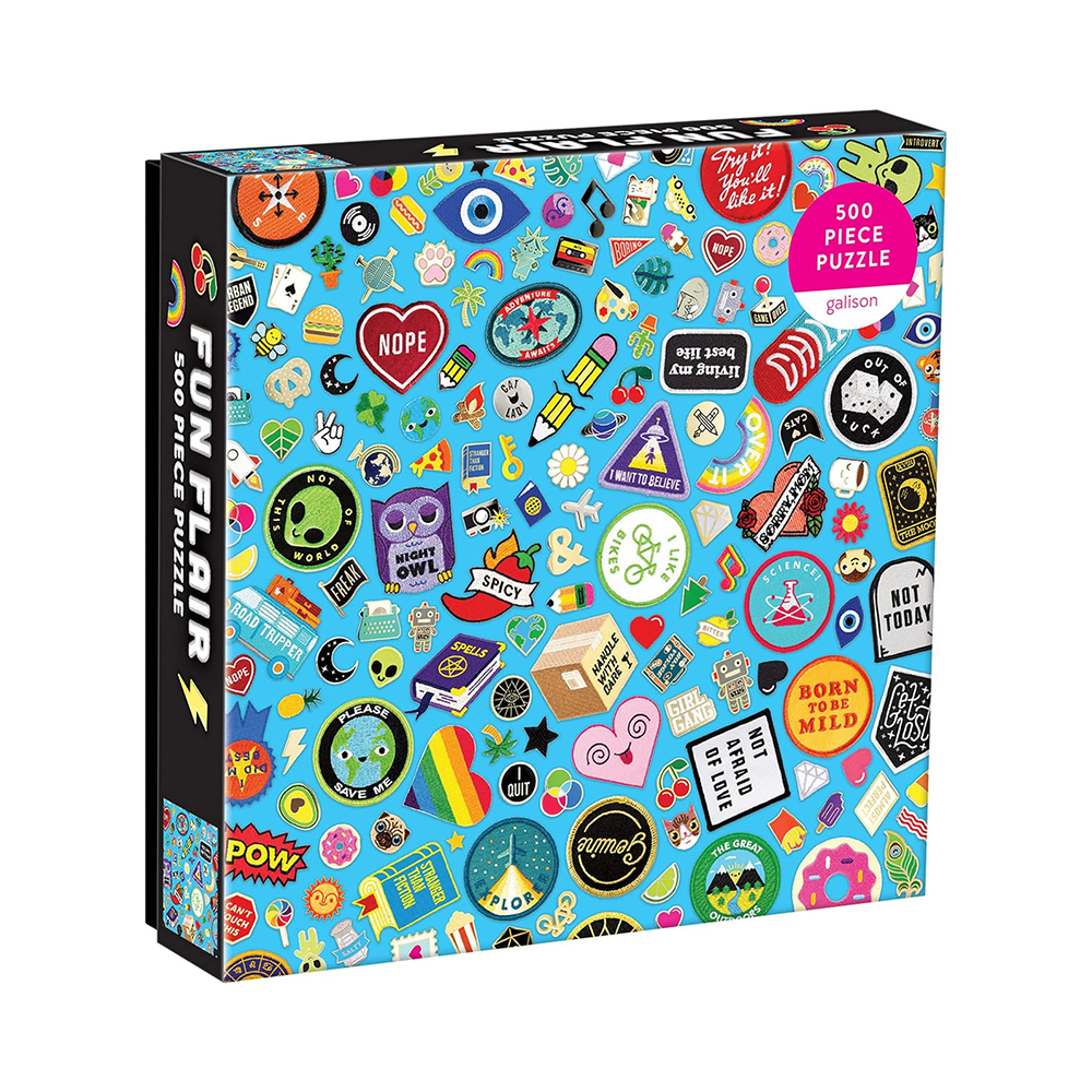 The Fun Flair 500 Piece Puzzle from Galison features an image of a collection of iron-on embroidered patches and enamel pins of popular sayings and cool images and signs from the collection of These Are Things. Galison puzzles are packaged in matte-finish sturdy boxes, perfect for gifting, reuse, and storage. An insert of the full puzzle image is also included. - 500 pieces - Box Size: 8” x 8” x 2”, 203 x 203 x 51 mm - Puzzle Size: 20” x 20”, 508 x 508 mm - Includes Insert