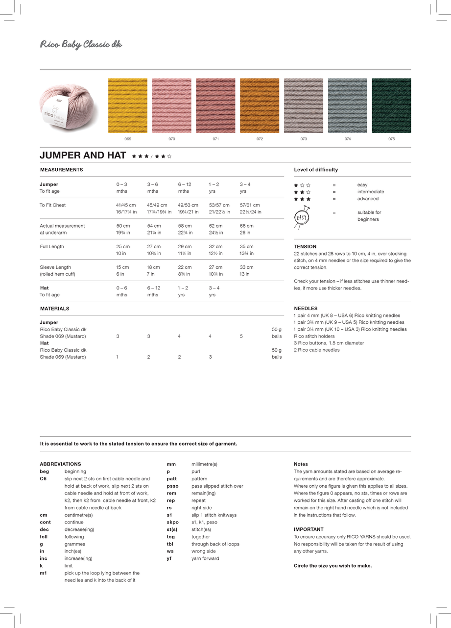 1 pair of 4mm (UK8 – USA6) Knitting Needles, 1 pair of 3.75mm (UK9 - USA 5) Knitting Needles, 1 pair of 3.25mm (UK10 – USA3) Knitting Needles, 2 Cable Needles. Stitch Holders, Safety Pin, 3 Buttons (1.5cm).
