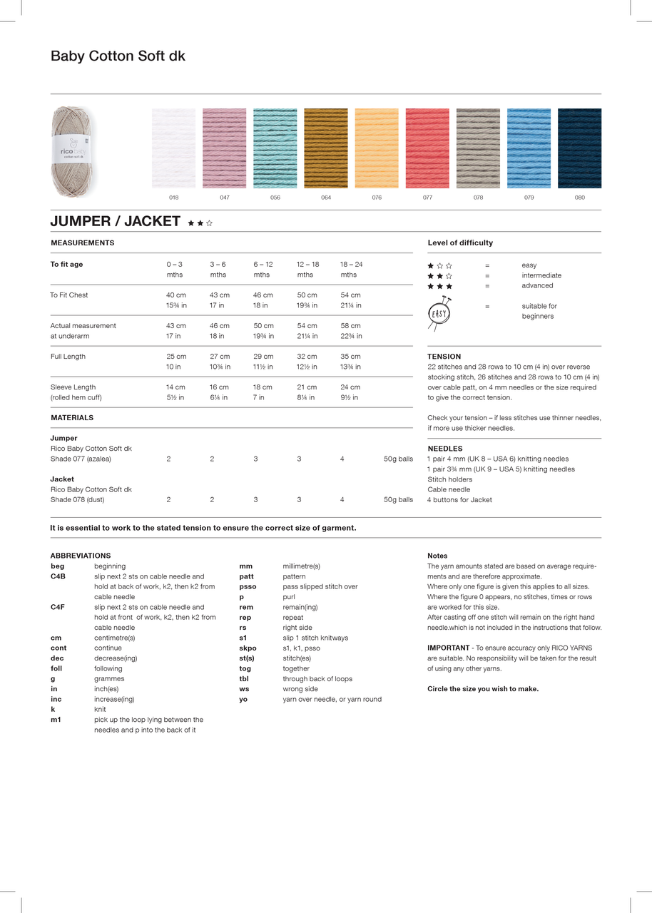 1 Pair of 4.00mm (UK8-USA6) Knitting Needles, 1 Pair of 3.75mm (UK9-USA5) Knitting Needles, Stitch Holders, Cable Needle, 4 Buttons.