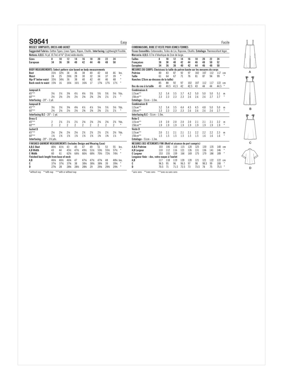 Easy-fitting jumpsuits and dress have elasticized back. Cropped length jumpsuits can be made with wide straps and patch pockets or tied shoulder straps. Knee length dress has tied shoulder straps. Kimono style jacket has wide elbow length, all-in-one cuffed sleeves and high-low hem.