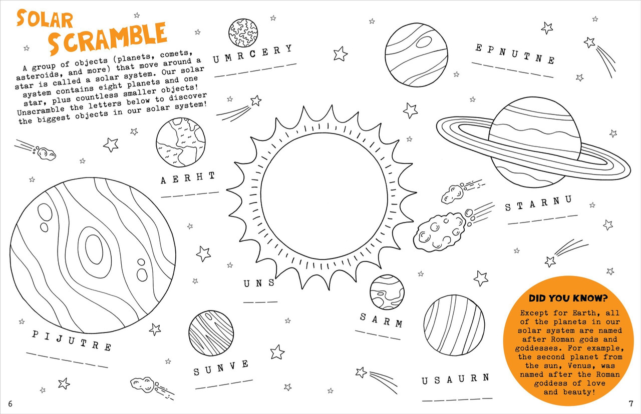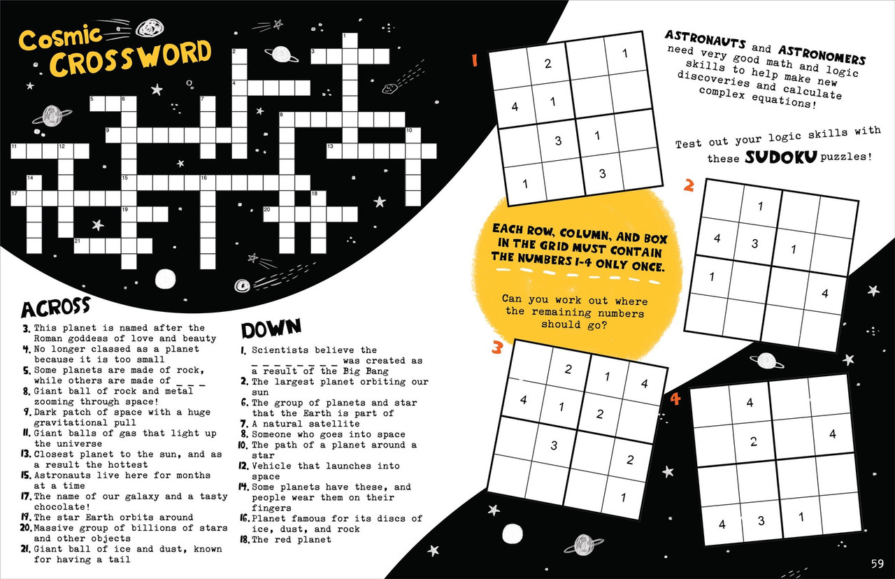 • Learn about space stations, stars, planets, and more as you trek through puzzles, activities, colouring pages, and more.