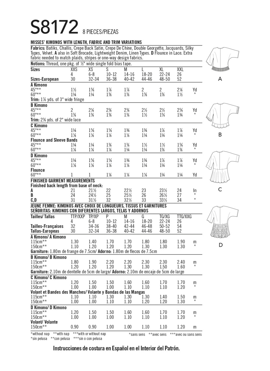 Kimono style jackets for women in a variety of lengths and trim options: fringe, lace, ruffles or flounces. Use contrasting fabrics or by the yard trims to get the look you love.