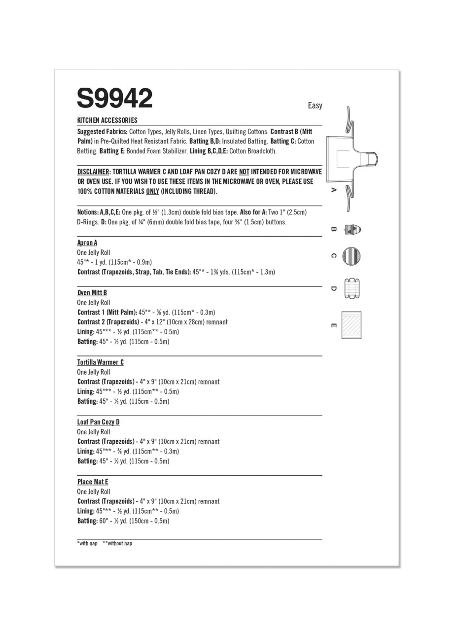 One size fits most apron and quilted kitchen accessories are pieced with simple stitch-and-flip quilting method. Apron has adjustable neck strap, back ties and roomy front pocket. Oven mitt suitable for left or right-handed use and has heat resistant fabric palm. 12" (31cm) diameter tortilla warmer has bias tape finish. Loaf pan cozy buttons to 8" (21cm) x 4" (10cm) to fit bread, rolls and other small table items. 16" (41cm) x 12" (31cm) place mat has handy cutlery and silverware pockets.