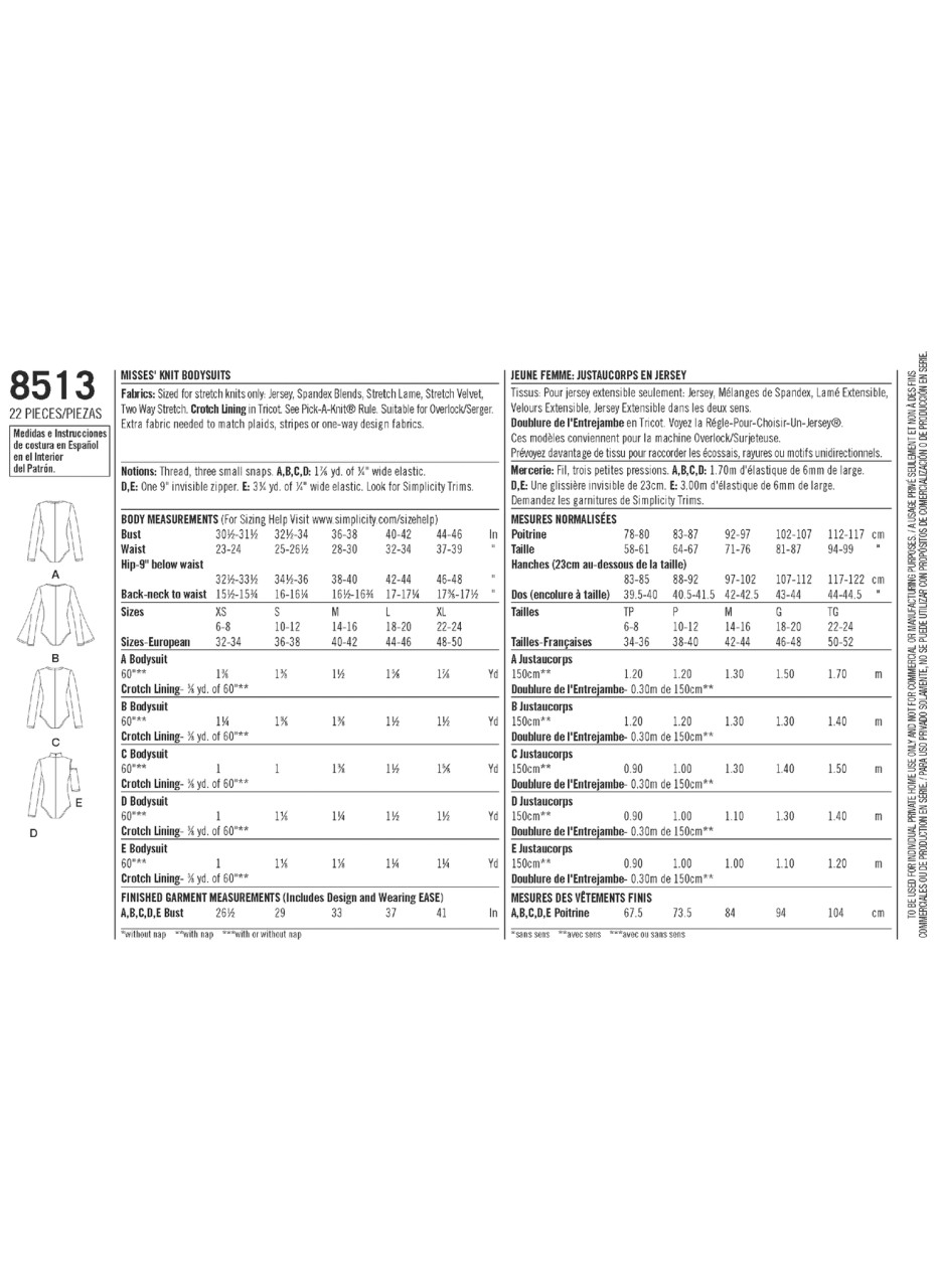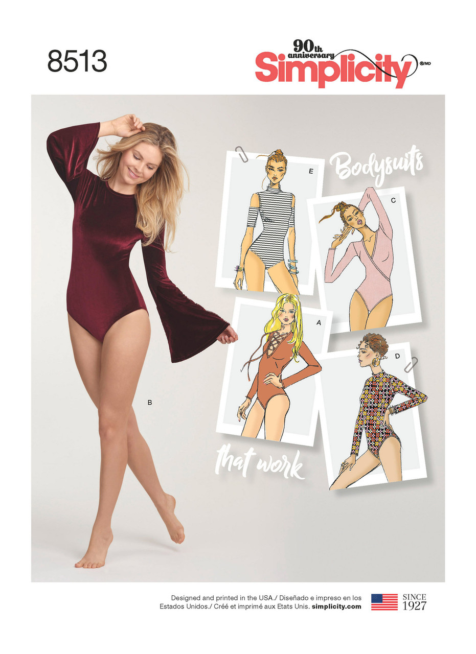 The perfect piece to add to any wardrobe-- the bodysuit! Make these trendy knit bodysuits in five styles. Bodysuits can be made with a mock neck, crew neckline, or a deep v-neck. Mockneck bodysuit has the option of being long sleeve or short sleeve with cold shoulders. Crew neckline bodysuit can be made with long bell sleeves. Deep v-neck bodysuit can be made with a wrap front or with a lace up front.