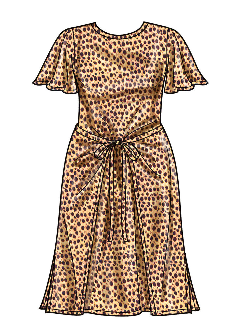 Easy to sew wrap style dresses have flutter sleeves or sleeveless option, front ties at the waist and back keyhole with button closure. Read More