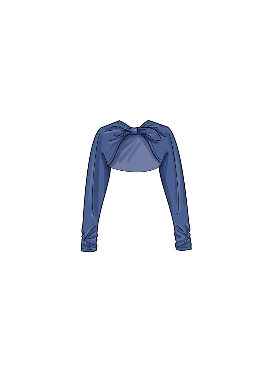 Semi-fitted dress in two lengths is slightly flared at hem and has back invisible zipper closure. View A dress is midi length with draped off-the-shoulder neckline. View B is a strapless long length dress. The shrug has center front knot with a pull through tie.