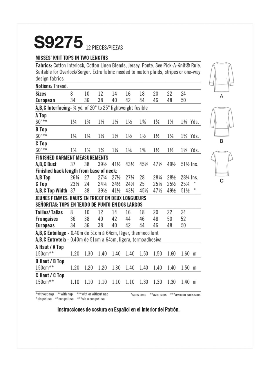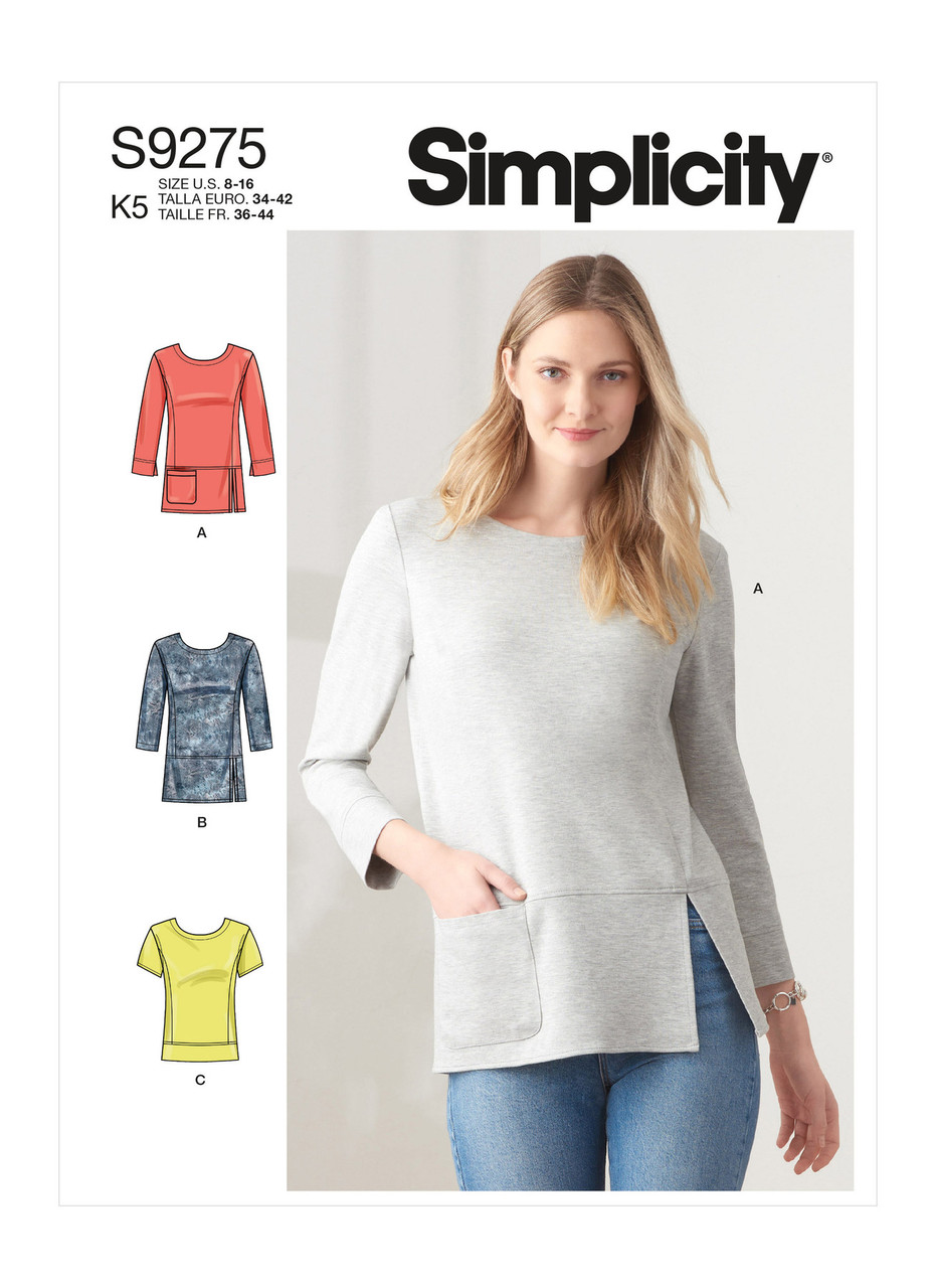 Misses' knit tops have rounded neckline & princess seams with sleeve & hem variations.