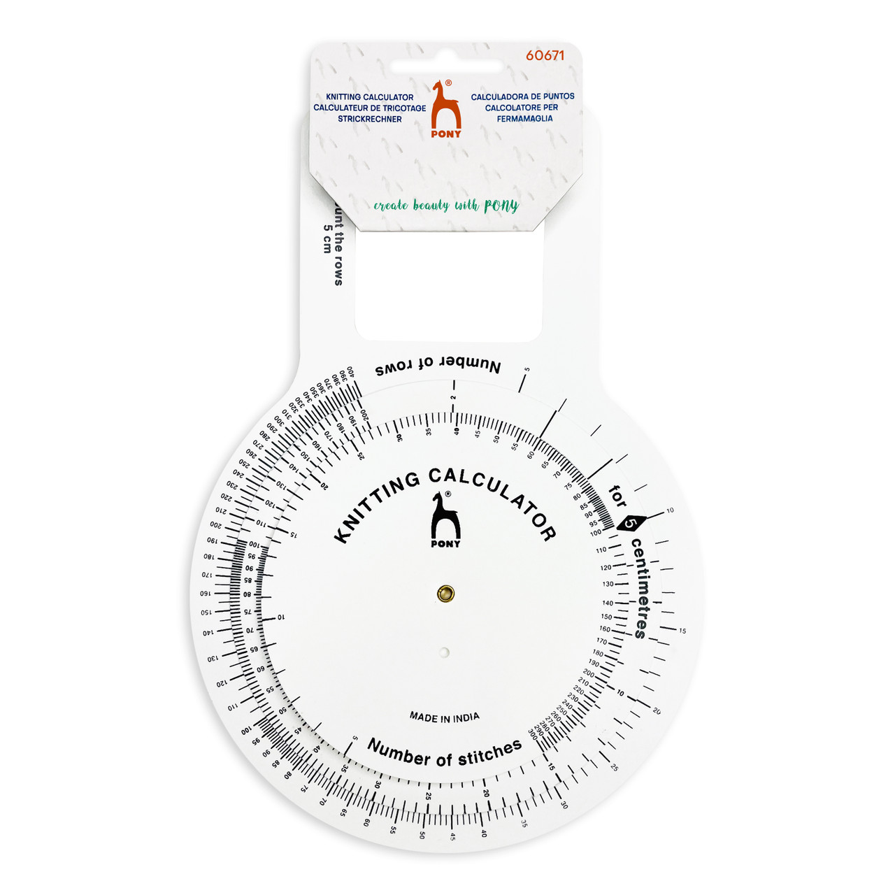 An ingenious tool for knitters. Converts centimetres into stitches and rows and adapts to any knitting pattern. Ideal for knitters designing their own garments. With complete instructions inside.