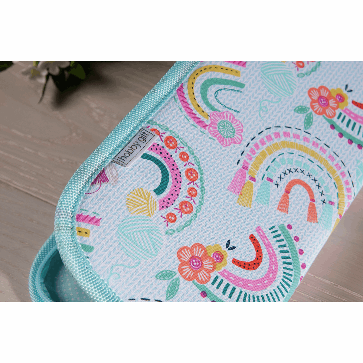 Knitting pin and crochet hook case made from 100% cotton fabric in a fun rainbow print.