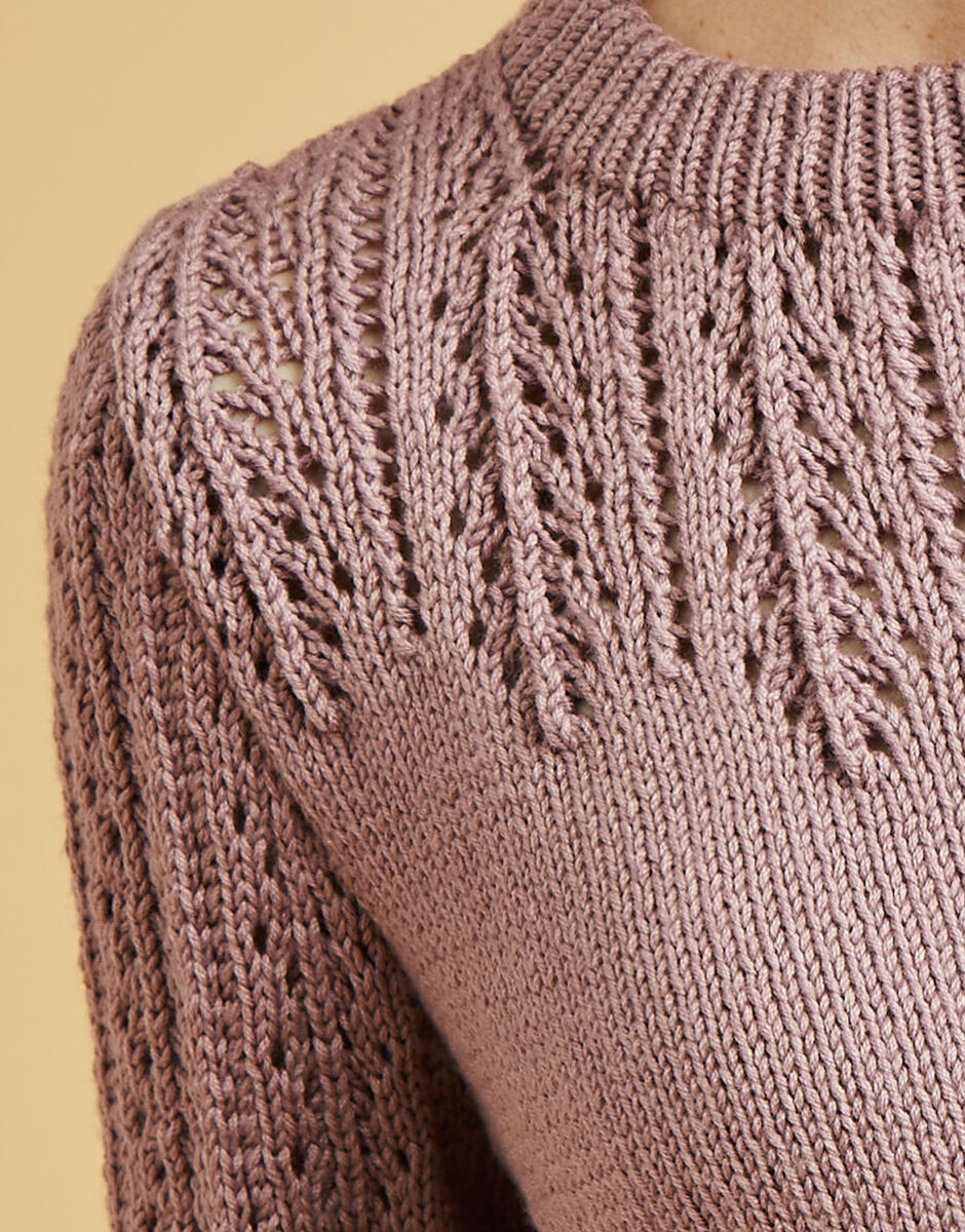 This knitting pattern features long ribbed cuffs, a crew neckline and a lace yoke. The travelling lace design at the yoke of the sweater is inspired by the architecture featured on the Sinclair Building.