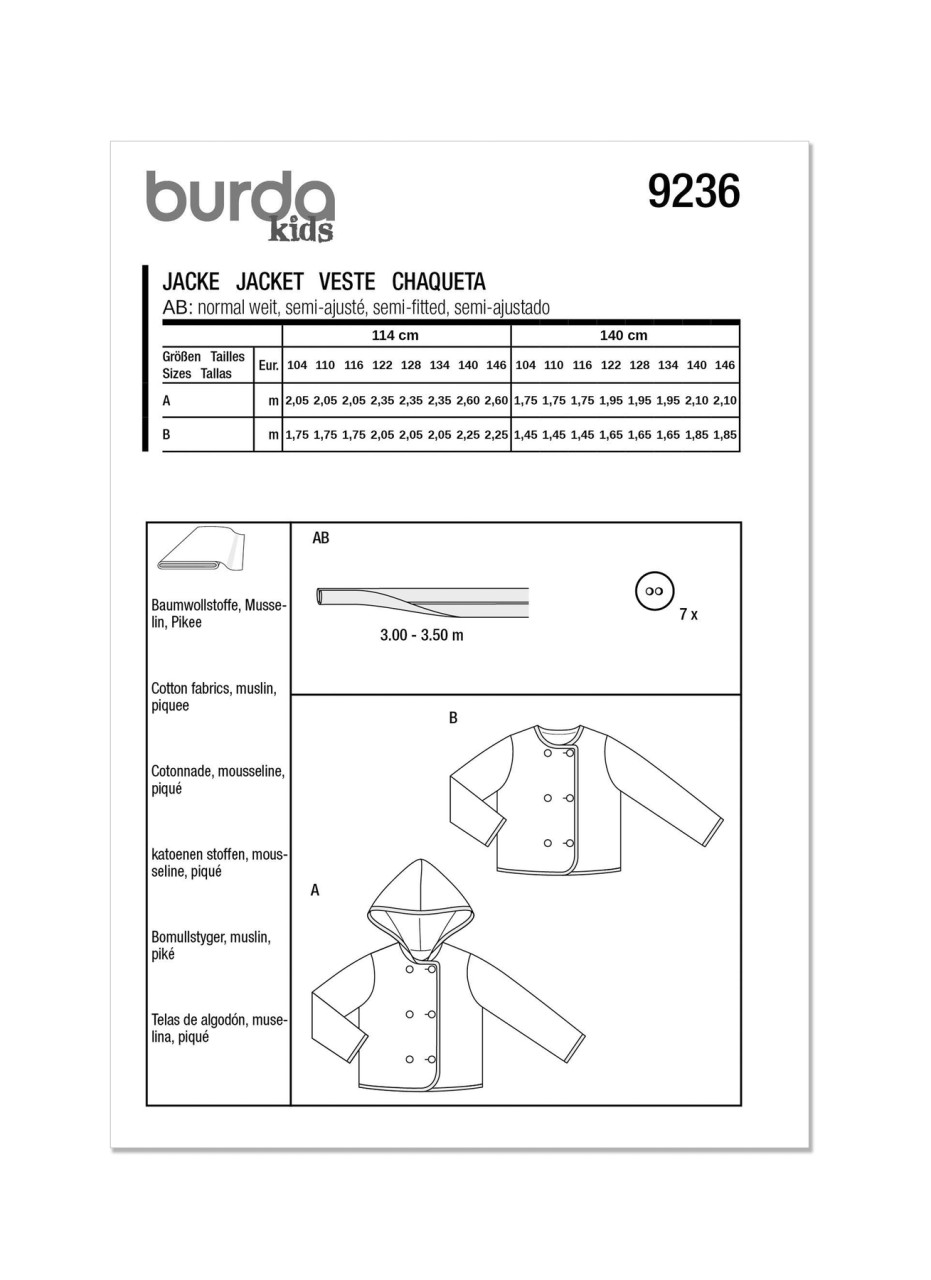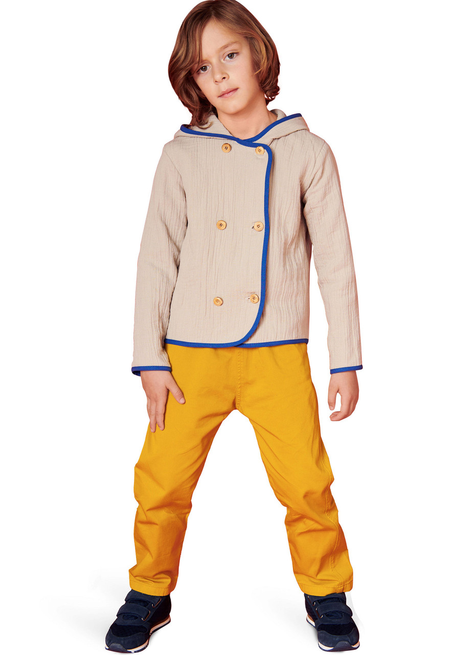 For both girls and boys, these lightweight jackets can be made up with or without a hood. Use bias tape in a contrasting color to bind the edges. The jackets are lined and have a button fastening.