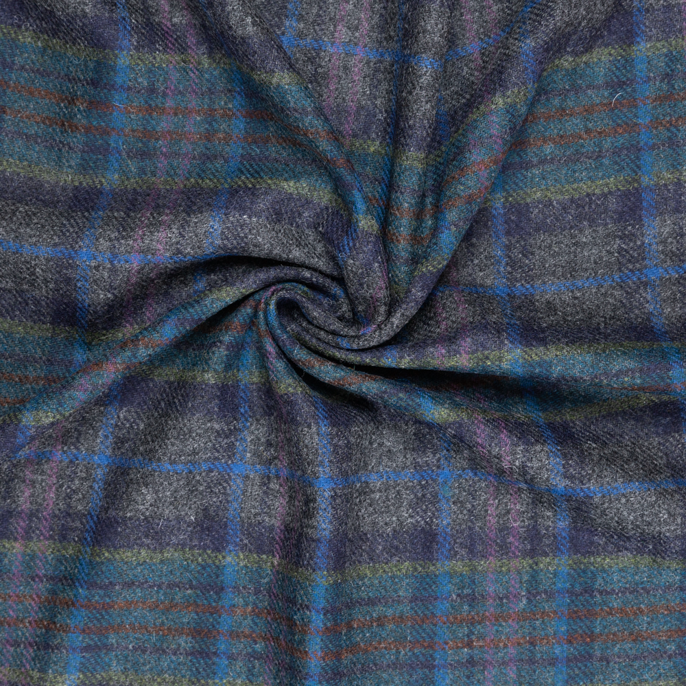 Experiment with shape, silhouette, and colour using our Lightweight Suiting: 100% Wool Tweed - Charcoal Jewel-Toned Plaid. We suggest a bold twist on an old tweed standby, creating a tailored tweed suit from this material. It features a soft, slightly fuzzy hand that's matched seamlessly with a full-bodied and somewhat structured drape. A background of greys and blues hosts jewel-toned stripes forming a cosy plaid. While opaque, we suggest pairing with a lining for a professional, clean finish, particularly on tailored garments.
