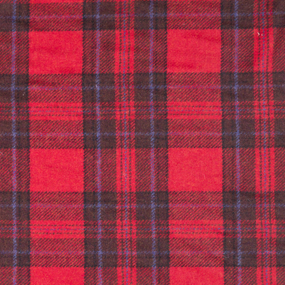 Experiment with shape, silhouette, and colour using our Lightweight Suiting: 100% Wool Tweed - Red/Chocolate Plaid. We suggest a bold twist on an old tweed standby, creating a tailored tweed suit from this material. It features a soft, slightly fuzzy hand that's matched seamlessly with a full-bodied and somewhat structured drape. A background of red and brown hosts a variation of blue stripes forming a cosy plaid While opaque, we suggest pairing with a lining for a professional, clean finish, particularly on tailored garments.