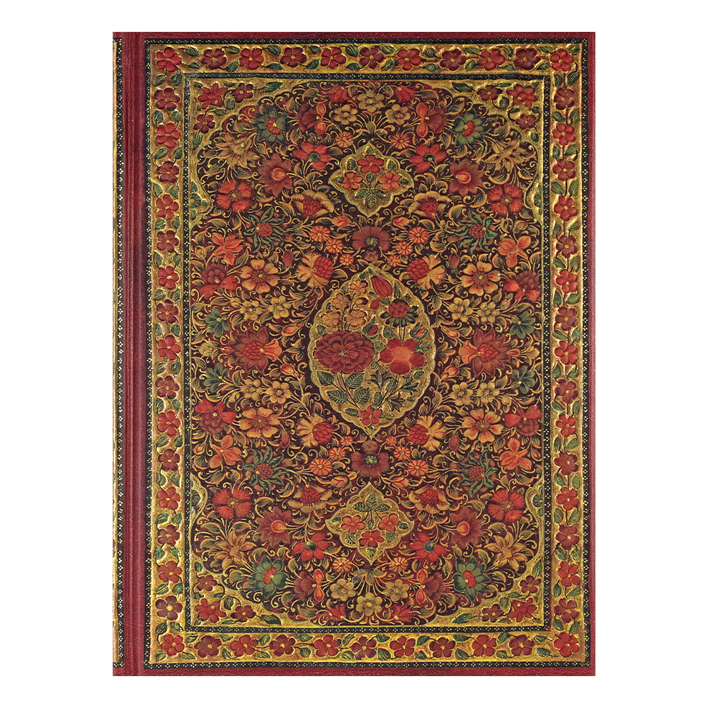This elegant journal replicates a gilded lacquer 19th-century bookbinding crafted for an illuminated Persian manuscript. The original lacquer work design was created with delicate layers of paint, a coating of shellac which was then carefully sanded to a shine, and subtle applications of gold leaf.