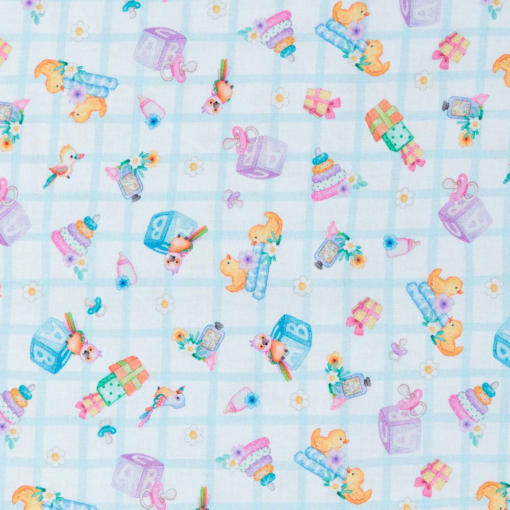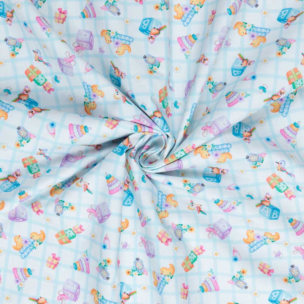 Nursery toys and other baby motifs on a white and blue check. Beautiful, high quality, printed cotton fabric. Ideal for quilting, masks, crafts, displays, table decoration and as a dressmaking fabric.