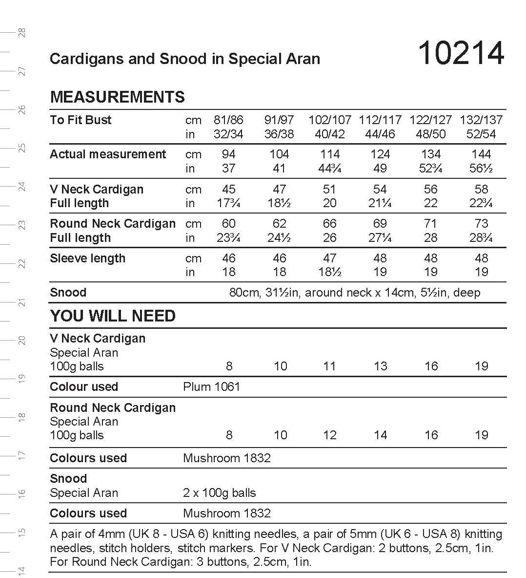 needles, stitch holders, stitch markers. For V Neck Cardigan: 2 buttons, 2.5cm, 1in. For Round Neck Cardigan: 3 buttons, 2.5cm, 1in.