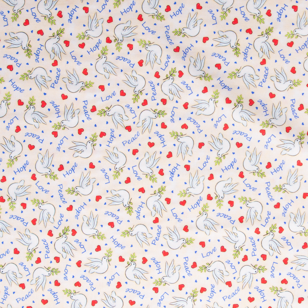 Red love-hearts, white doves and 'hope' and 'peace' sentiments cover this off white background. Beautiful, high quality, printed cotton fabric. Ideal for quilting, masks, crafts, displays, table decoration and as a dressmaking fabric.