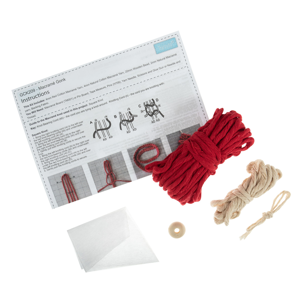 • Kit includes: 4mm, red, cotton, Macramé yarn; 4mm, natural, cotton Macramé yarn; 16mm wooden bead and instructions in three languages (EN, FR, GER).