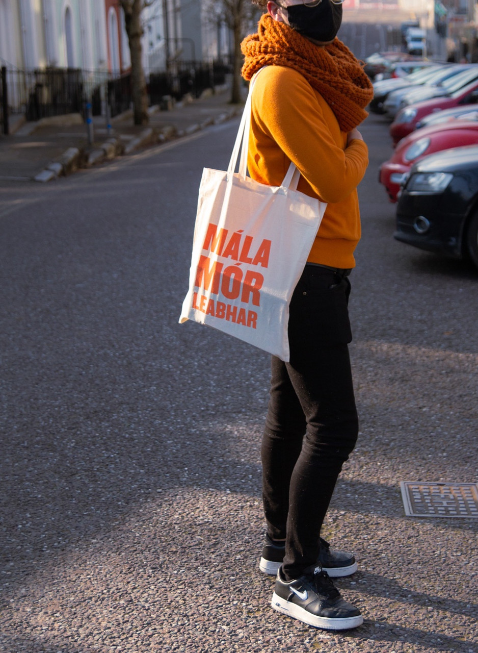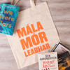 100% cotton tote bagthat says "Mála mór leabhar" (Big Bag of Books) on both sides.