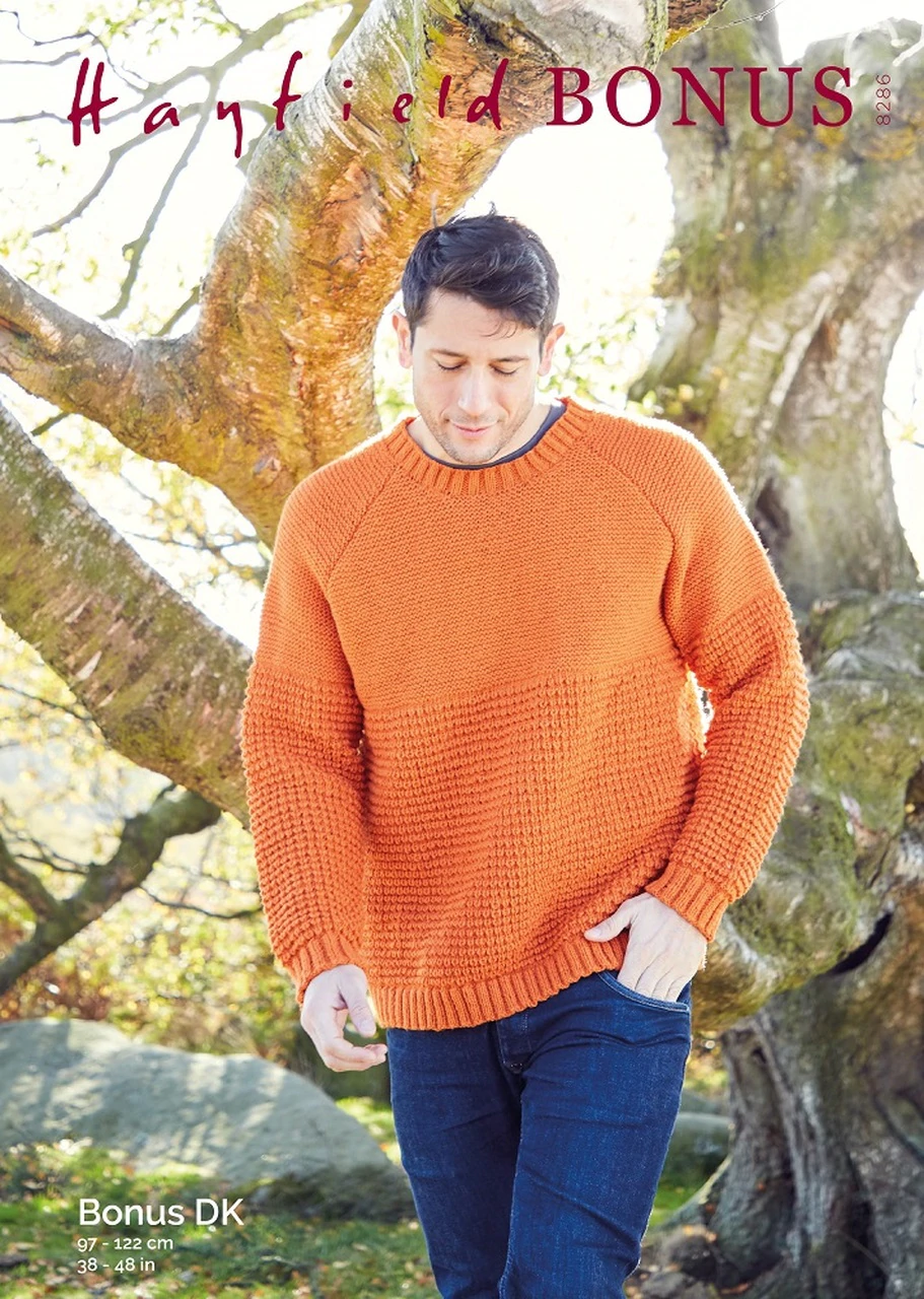 Man's Sweater with a Blackberry Stitch, knitted in Hayfield Bonus Double Knitting a high quality Acrylic yarn. Choose your favourite shade from the wide range.