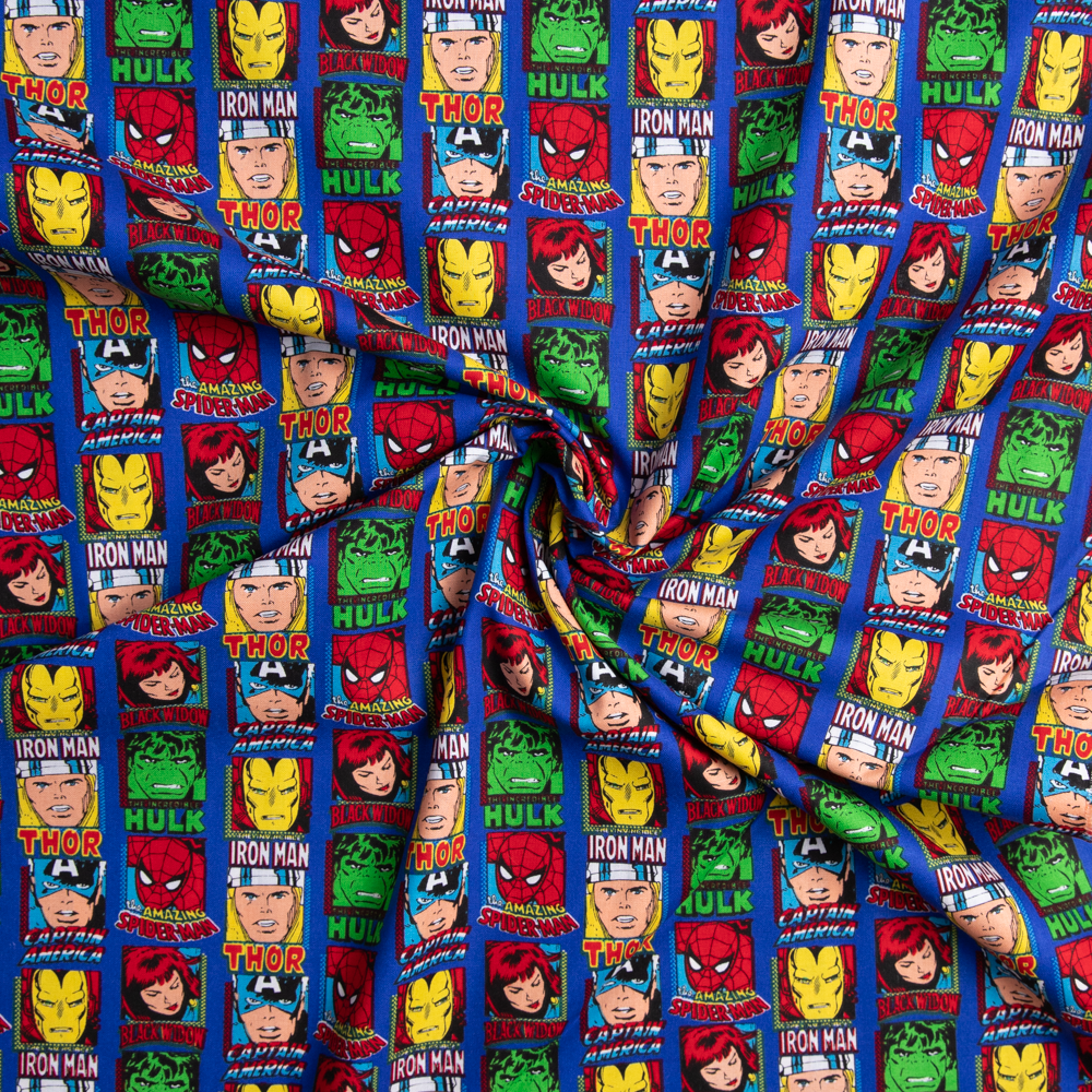 Iron Man, The Hulk, Spider Man, Captain America, Thor and Black Widow create this Marvel print on royal blue. Beautiful, high quality, printed cotton fabric. Ideal for quilting, masks, crafts, displays, table decoration and as a dressmaking fabric.