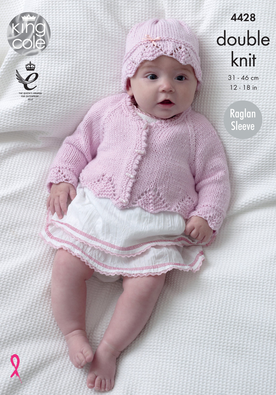 1 pair of 3.75mm knitting needles, 1 pair of 4.00mm knitting needles, 3 x buttons for Matinee Coat, 4[4:4:5] x buttons for Cardigan, 4[4:4:6] x buttons for Jacket, 0.5 metre of narrow ribbon for Girl’s Hat, 0.5 metre of narrow elastic for Boy’s Hat.