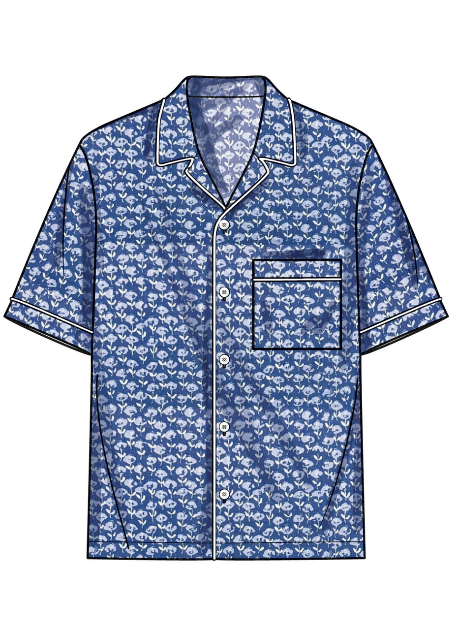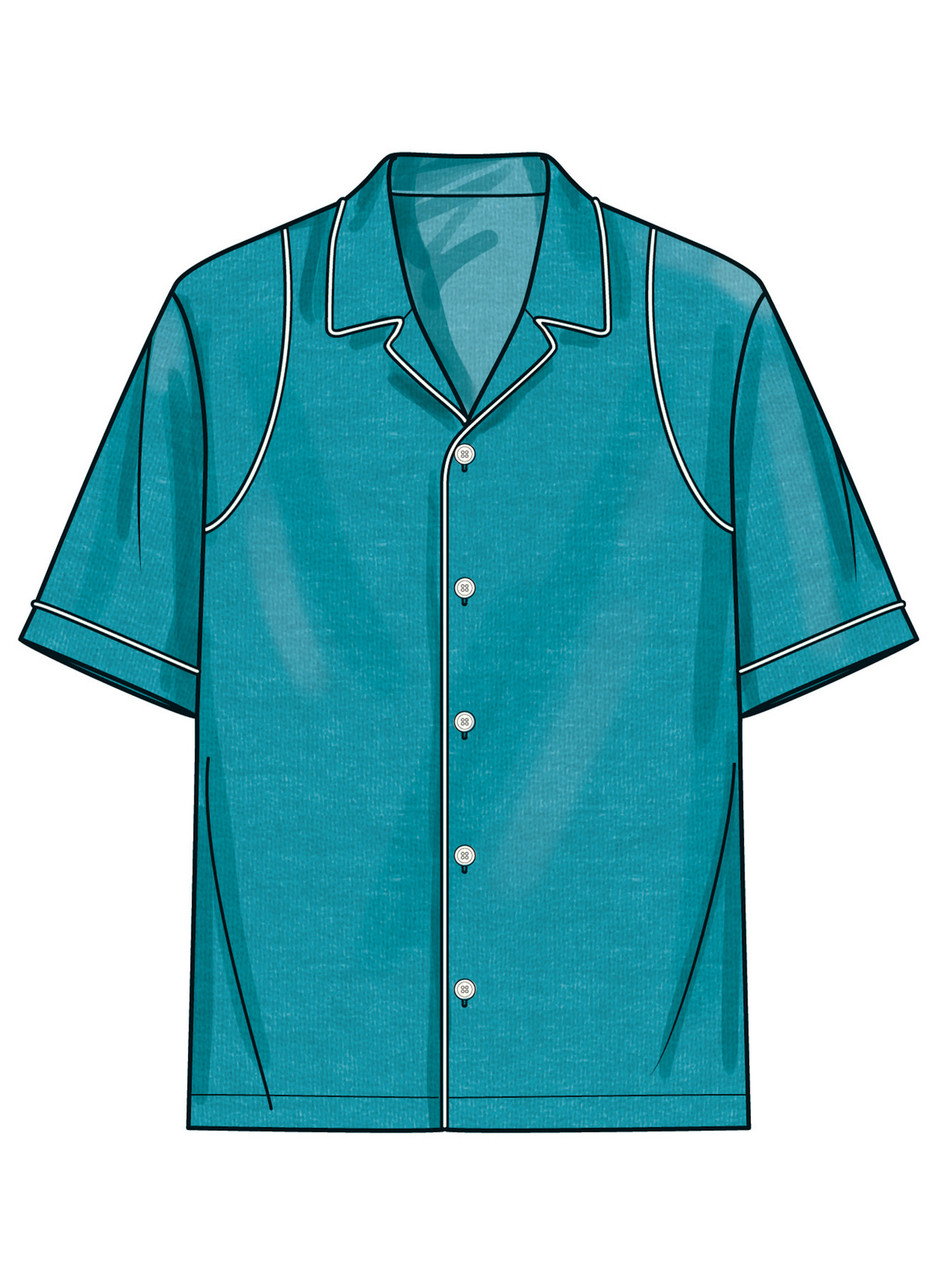 Relaxed fit button front shirt pattern has notched collar, dropped shoulder sleeves, sleeve bands and top stitching at hem. Views A and C have front pocket. Views B and C have purchased piping.