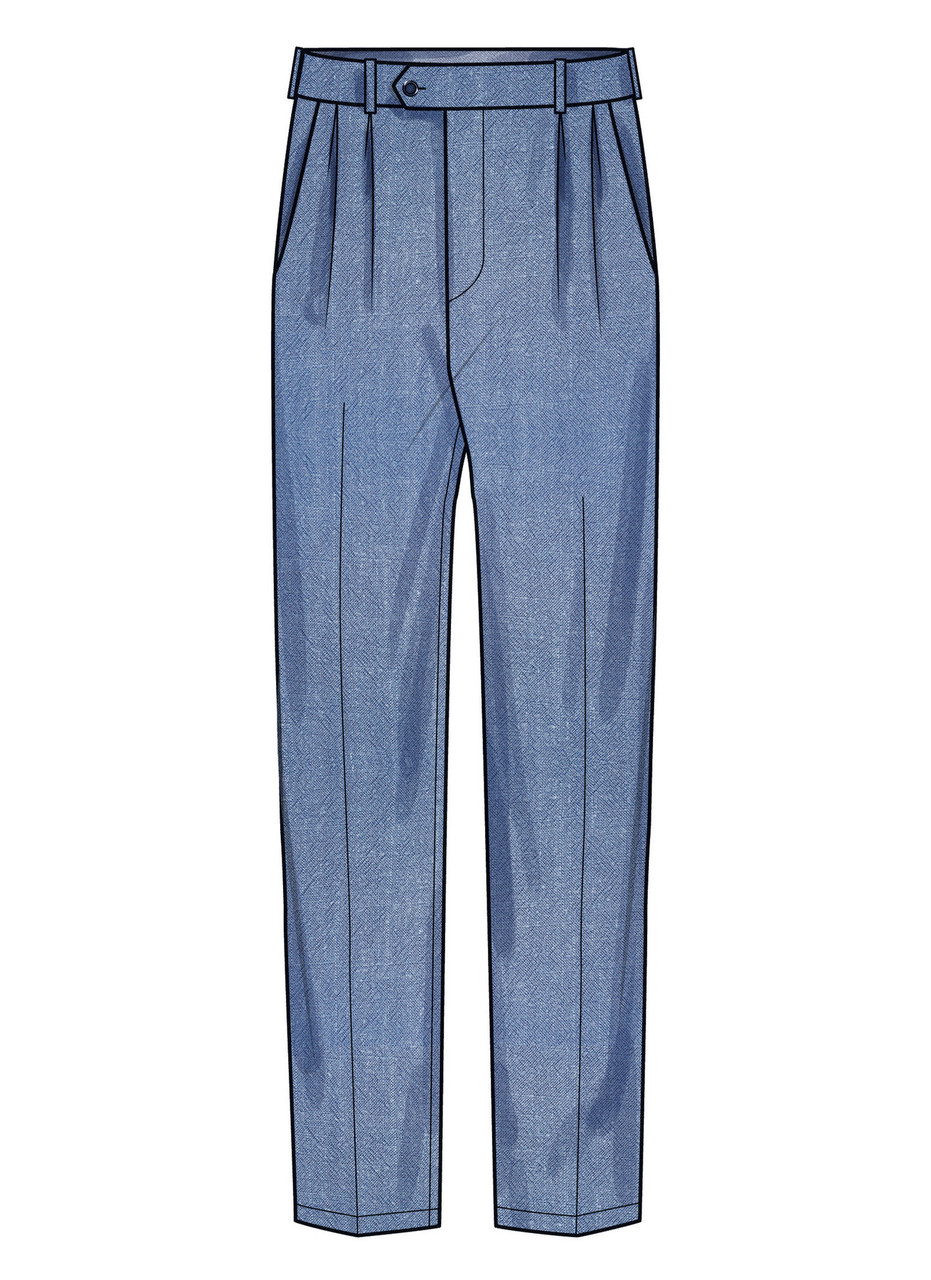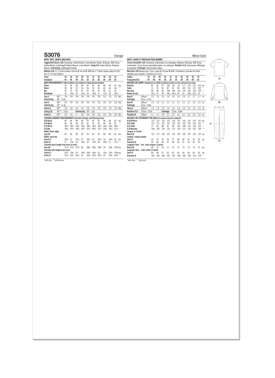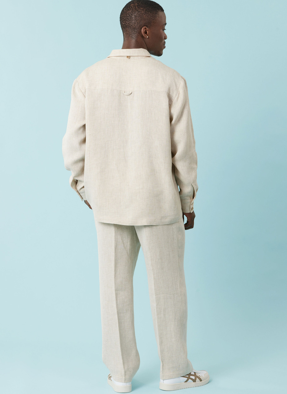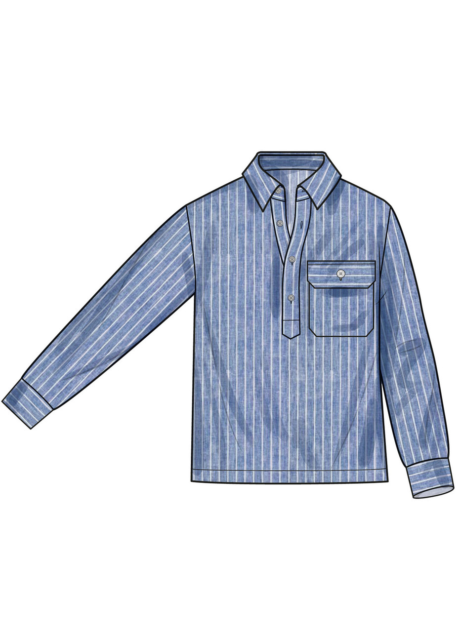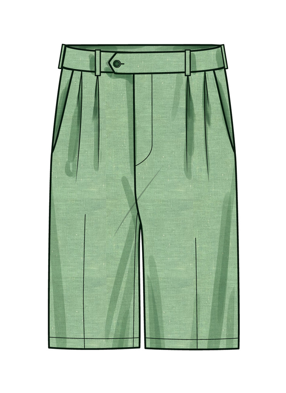 Popover shirt patterns with long or short sleeves have half placket, dropped shoulders, back yoke, single patch chest pocket with flap and button closure. View A has collar band and side slits at hem. View B has sleeves with continuous lap opening, cuffs with button closure and collar with collar stand. Shorts and pants have front pleats, back darts, waistband with belt loops and tab closure, side pockets and faux back welt pocket on the right side.