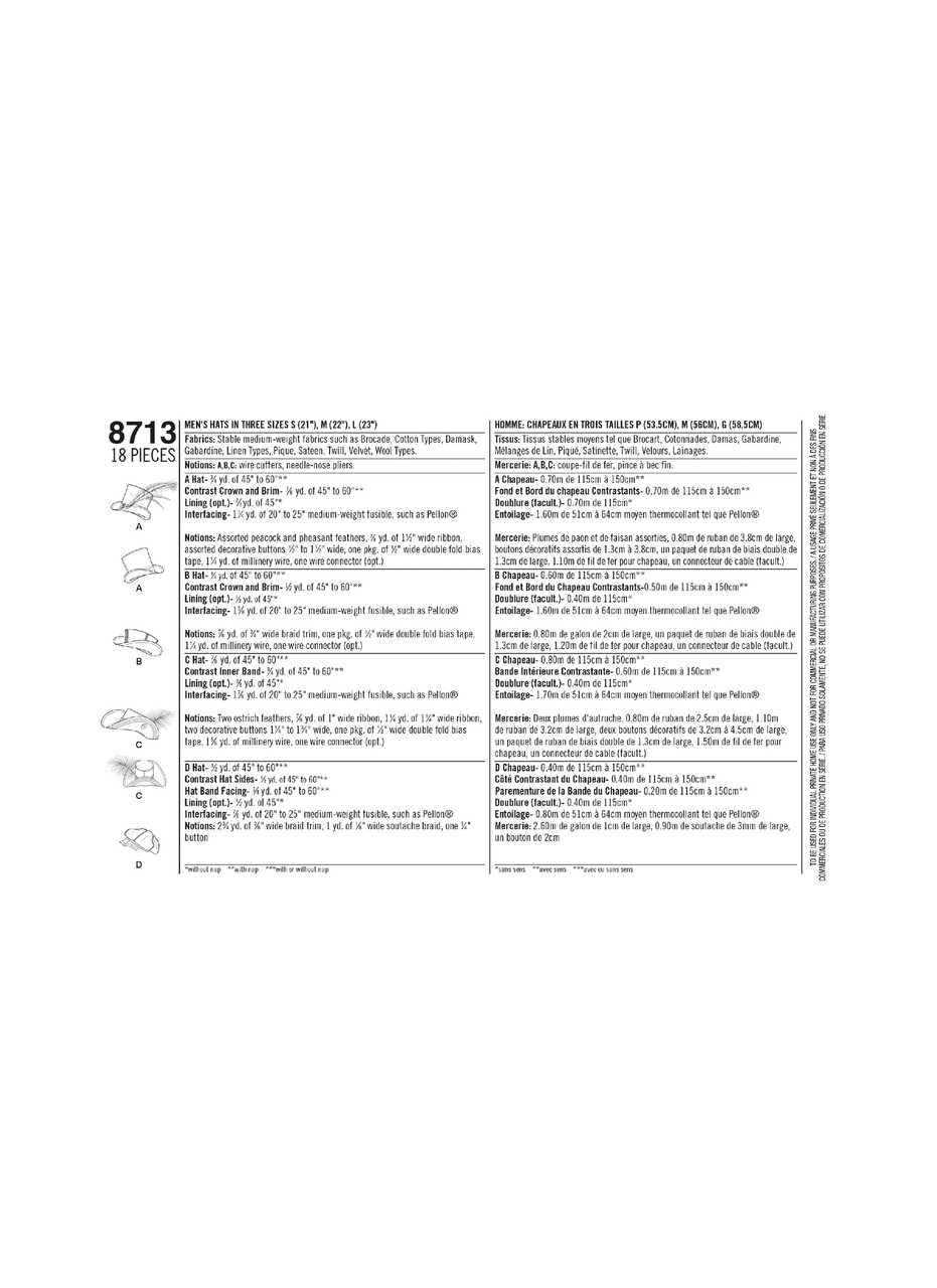 Men's Artivestry hats in three sizes S(21"), M(22"), L(23"). This pattern offers four styles—top hat, topper, pirate and poboy hat. Click this link to learn more about Arkivestry: http://www.arkivestry.com/.