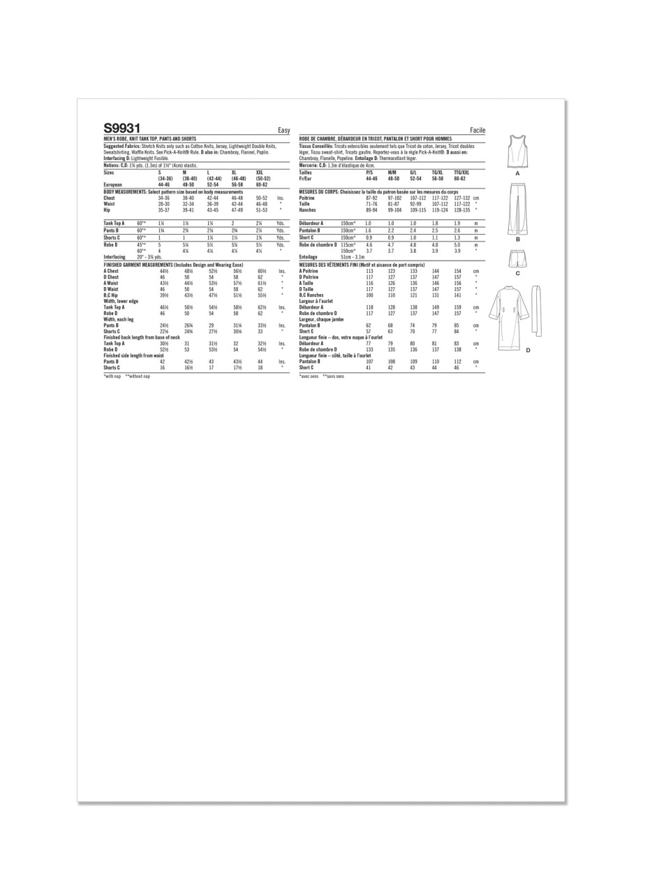 Comfy and stylish, create this easy to sew lounge set for Men. Pattern includes robe, tank top, pants and shorts. Oversized fit robe has dropped shoulder sleeves and belt. Pull-on pants and shorts have elastic waistband and side pockets.