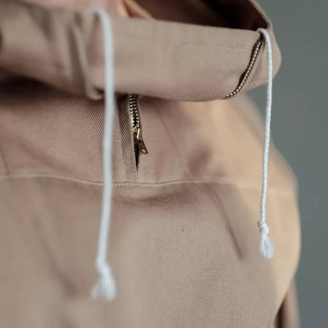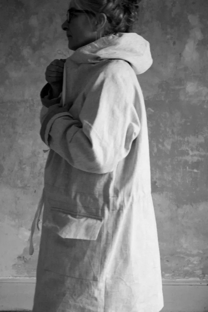 The hooded Landgate is chic yet workaday and features a drawstring waist and side and front pocket options. Our first pattern for both men and women.