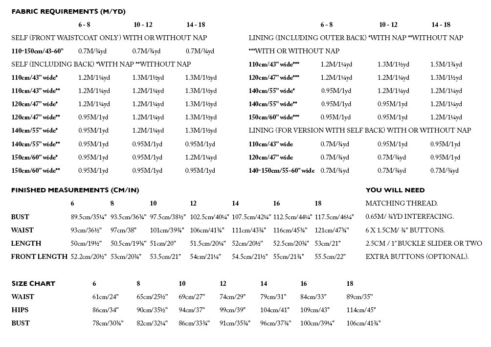 5-8oz linen, 5-10oz denim, light - medium weight corduroy, wool, wool blends, cotton canvas or twill. For the lining: lightweight wovens such as calico, cotton lawn, cotton, cotton blends, Tencel/linen (when choosing your cloth consider that the lining fabric may be visible).