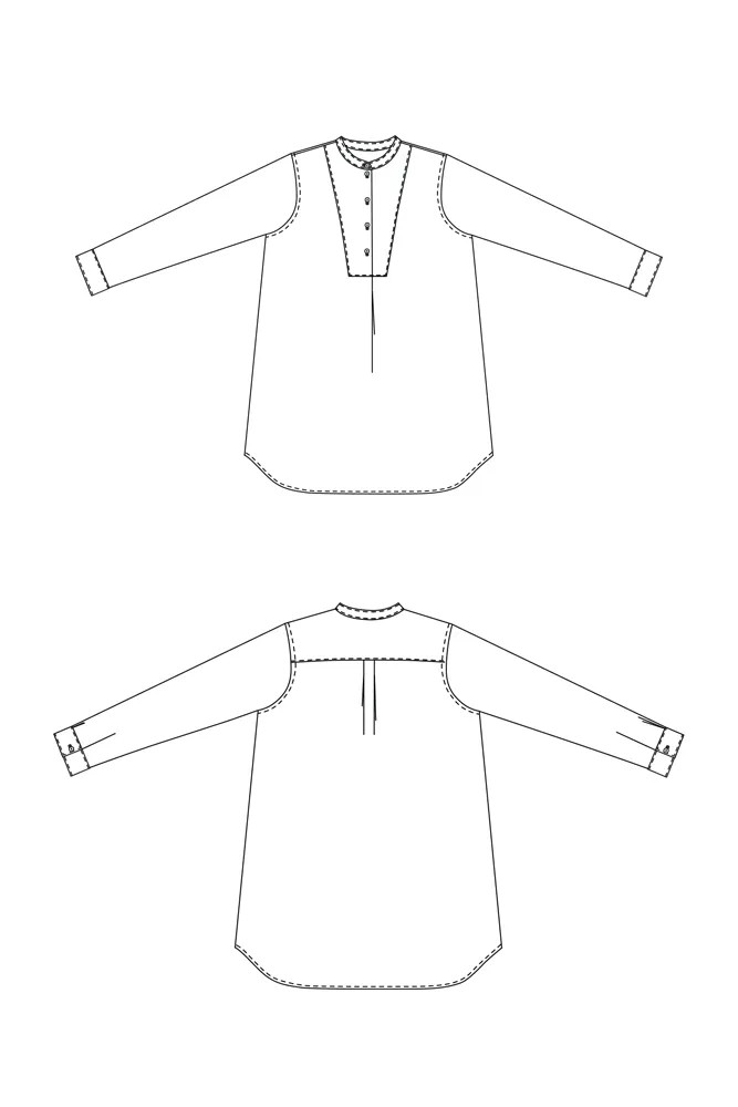 A classic shirt-dress or shirt featuring a bib, grandad collar and cuffed sleeves. Dress has in-seam pockets.