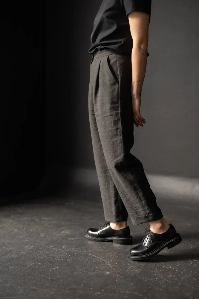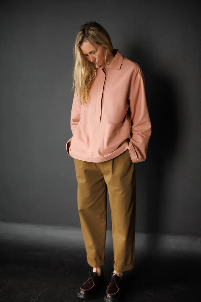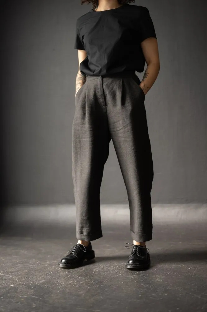 The Pegs are ideally suited to a mid-heavyweight cotton canvas, 8oz organic sanded twill, corduroy, light-medium weight woollens and 7-10oz denim. Lighter weight cloths like linen and tencel-linen will give you a softer silhouette.