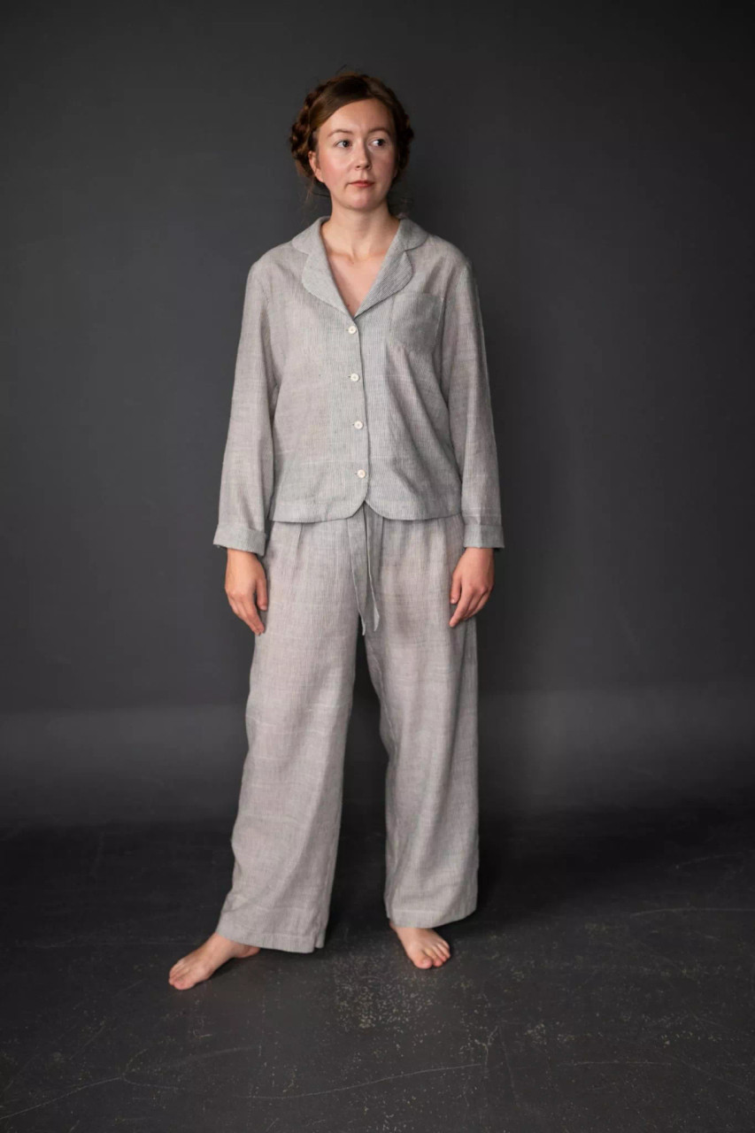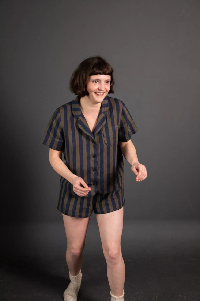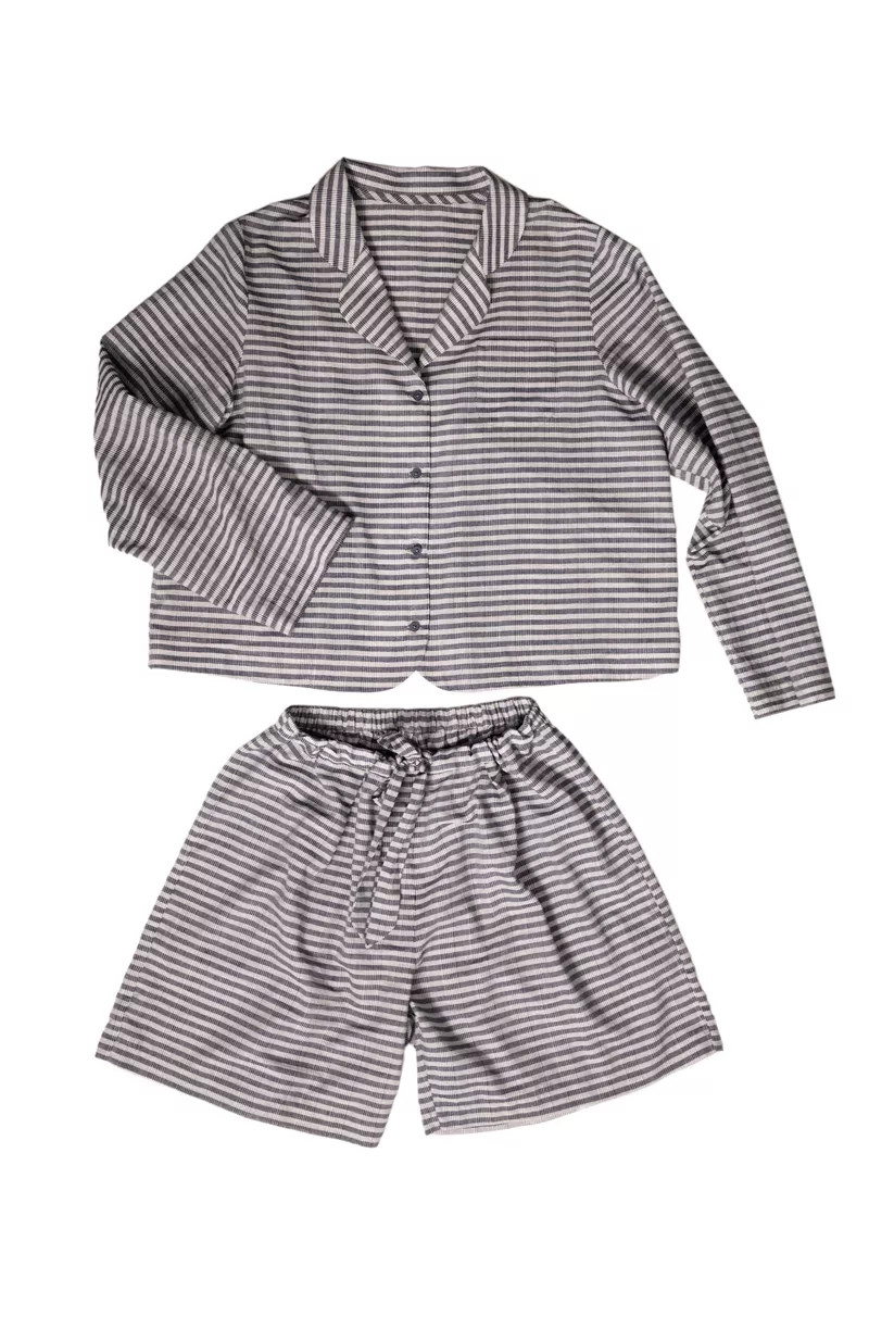 A traditional pair of pyjamas with either long or short sleeves and long, short or short - short bottoms. The top and short - short bottoms can be piped (optional).