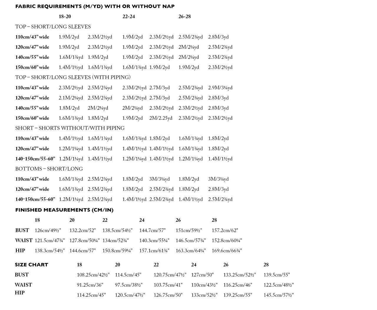 - When consulting the 'fabric requirements' chart you need to add your top choice and bottom choice together to get the total amount of fabric you need for the set.