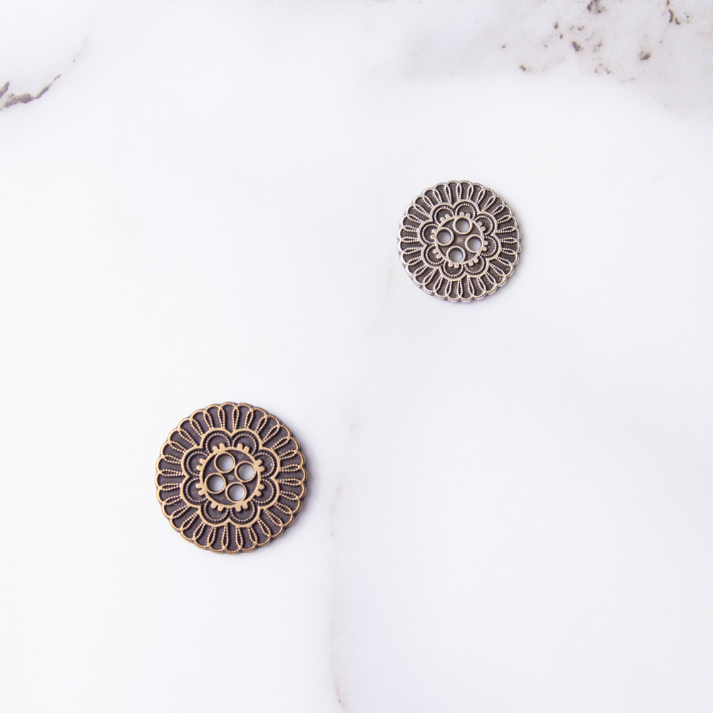 Metal buttons are great for just about any application; from blouses to trousers, to pillow accents or handbags. Here we have a round, metal, filigree style button featuring four centered holes within a center rim.
