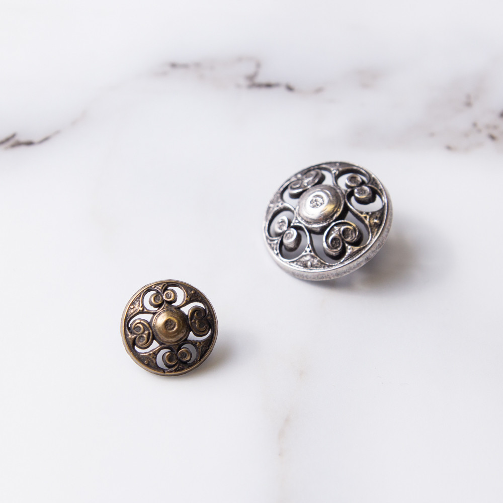 Metal buttons are great for just about any application; from blouses to trousers, to pillow accents or handbags. Here we have a round, metal, filigree style button featuring four centered holes within a center rim.