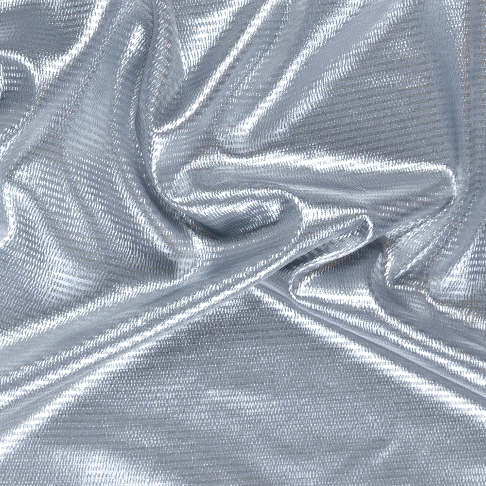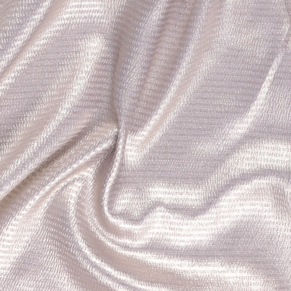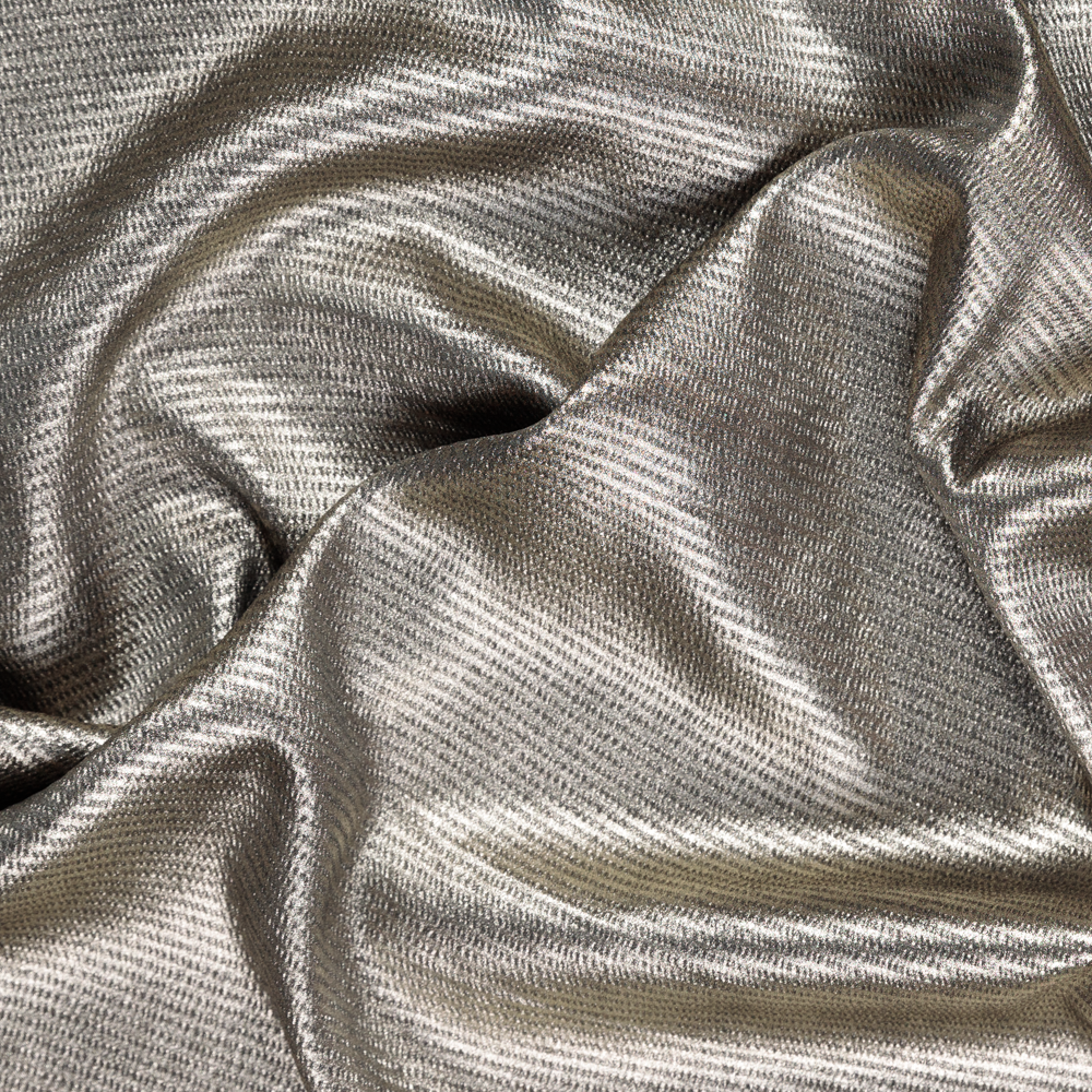 Cozy and luxurious lightweight fashion and costumewear is easy with this Metallic Foil Print Polyester. Featuring a smooth, sleek hand and fluid drape it has an almost slightly ribbed stripe effect made of tiny embossed rectagles. Perfect for dresses, tops, lined jackets it's great for evening wear and versatile for Mother of the Bride looks with it's elegant colourways.