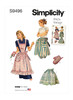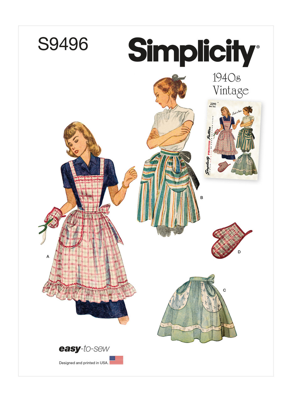 Direct from the Simplicity Archives circa 1948, aprons have full gathered skirts, waistbands with tie ends and oversized rounded pockets with binding finishing the edges. Full apron has angled shoulder straps and baby rick rack trim. Play with stripes or contrast fabric pockets and inserted band for a unique half apron. Quilted oven mitt included.