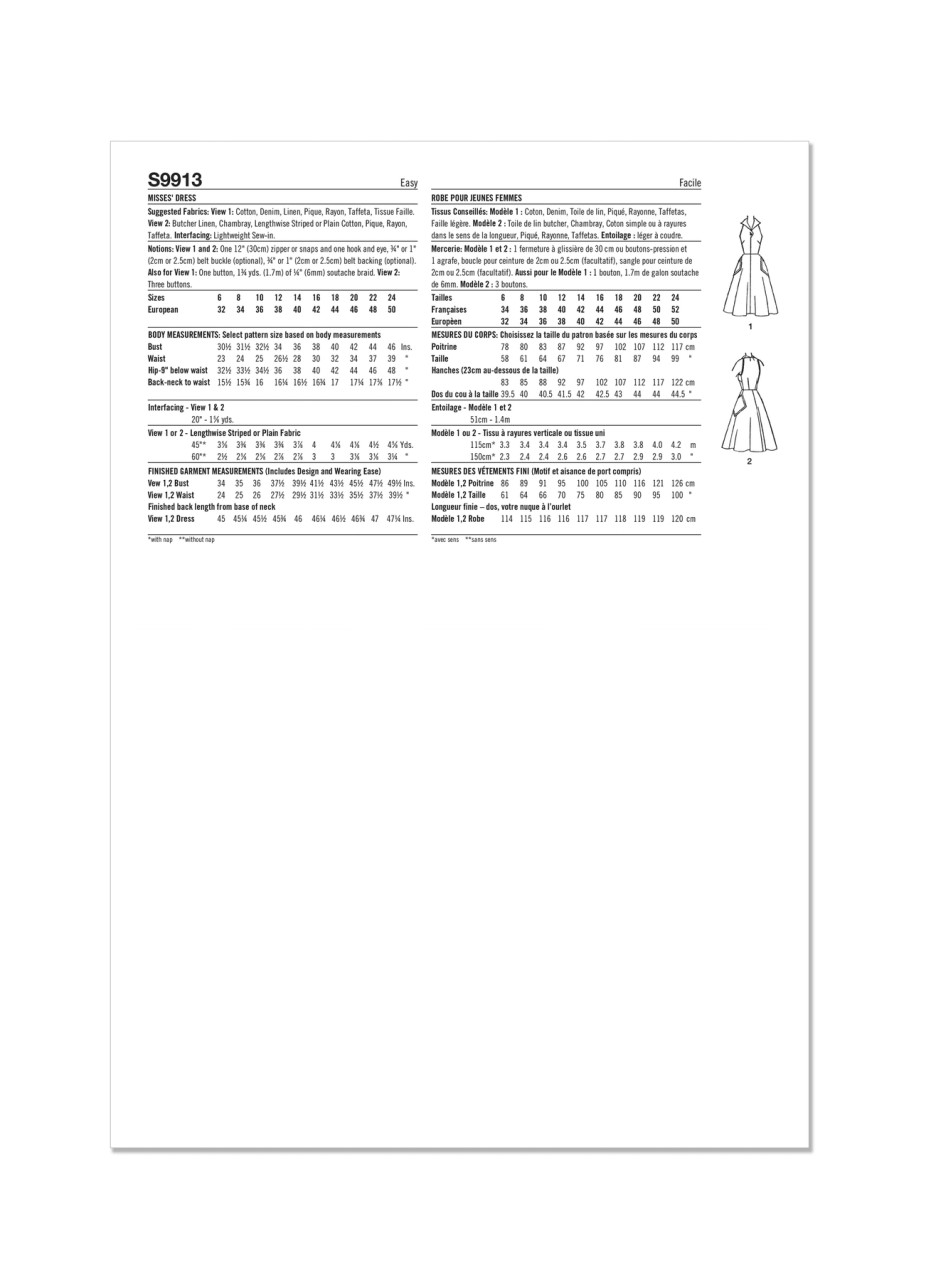 Vintage Simplicity 1950's one-piece dress sewing pattern. The collar and bodice of this sleeveless dress are cut in one. The bodice has a lapped front closing above center front seam and collar is tapered at center back. Patch pockets trim flared skirt. View 1 has soutache braid trim. View 2 top stitched pockets are buttoned to skirt. Authentic Vintage Reproduction includes additional sizes and cutting layouts.