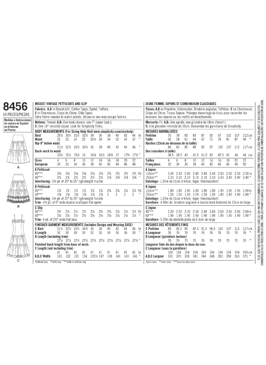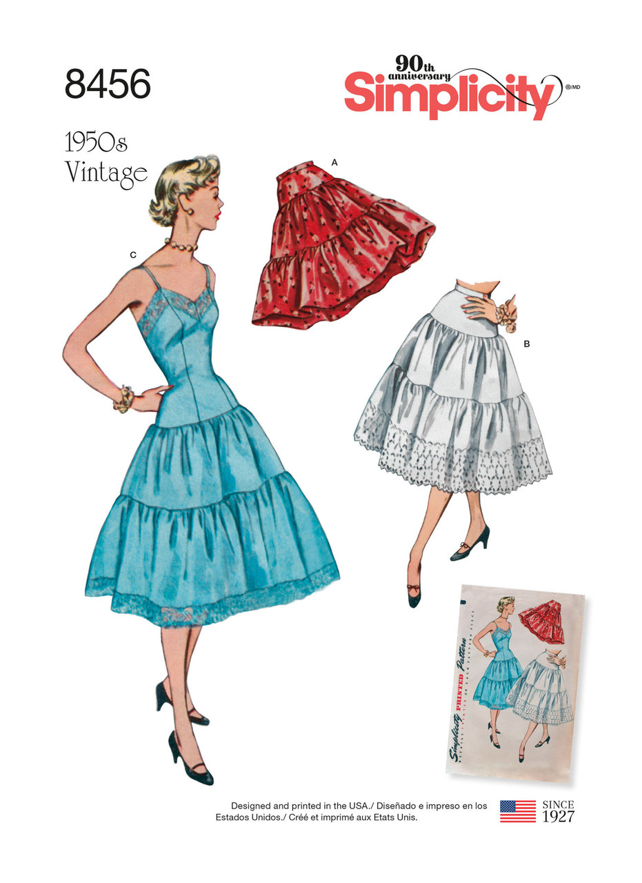 This 1950s vintage pattern for Misses includes a petticoat fashioned with two gathered tiers and joined to a fitted yoke with an optional band of eyelet added to the lower section. The full slip features a long fitted bodice with skirt cut in two gathered tiers, lace bands accent the upper edge of the bodice and the lower edge of skirt. Vintage