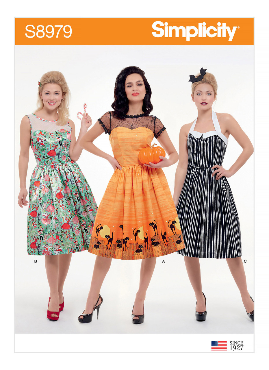 Full-skirted dresses. View A uses a border print fabric. View A and B have sheer upper bodices. View C has a halter neck and trim