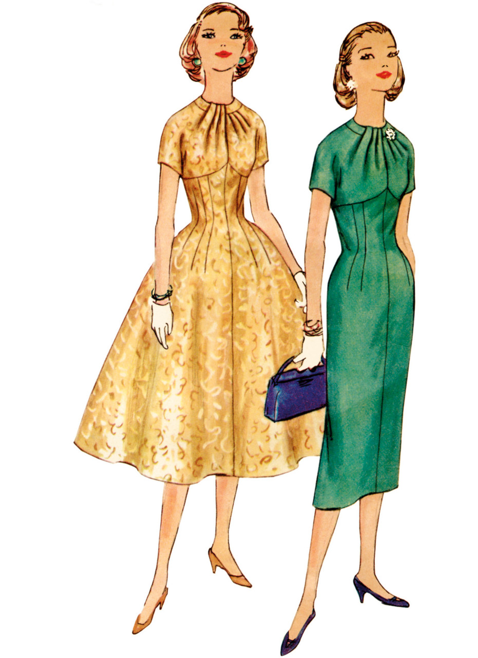 Vintage Simplicity 1950's dress sewing pattern. Empire-line dress has short kimono sleeves and neck band to which upper edge of bodice front is softly pleated. Pleated section crosses right over left at neck edge. Dress has back neck zipper opening. View 1 has flared skirt; View 2 has sheath skirt with back pleat. Both skirts are fitted with waistline-darts and shaped to a point in front; cut straight in back at upper edge. Authentic Vintage Reproduction includes additional sizes and cutting layouts.