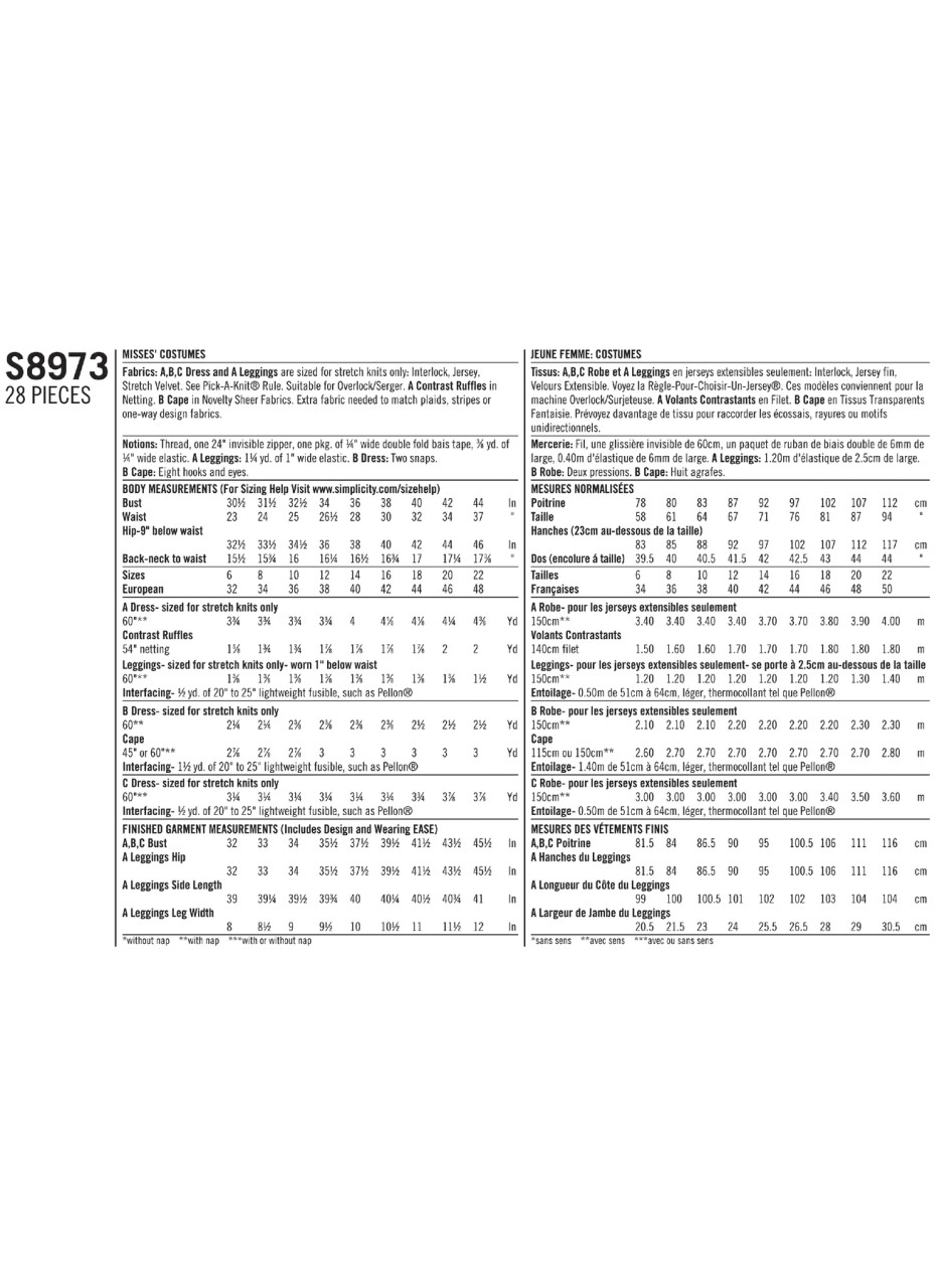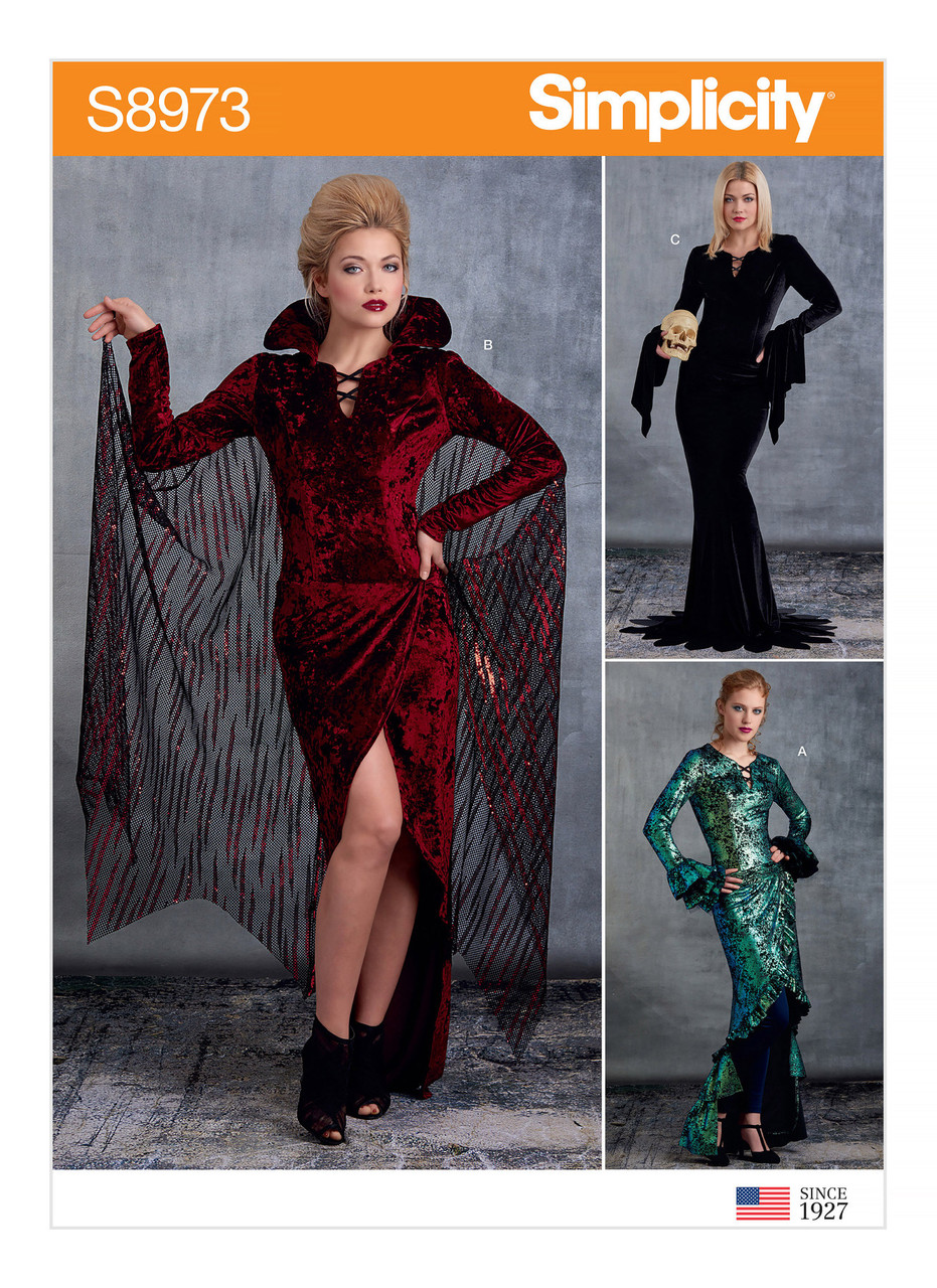 Misses’ ‘Femme-Fatale' Costumes. Close-fitting dresses with princess-seamed bodices. Skirts have style and trim options. Pull-on leggings. Shaped Cape.