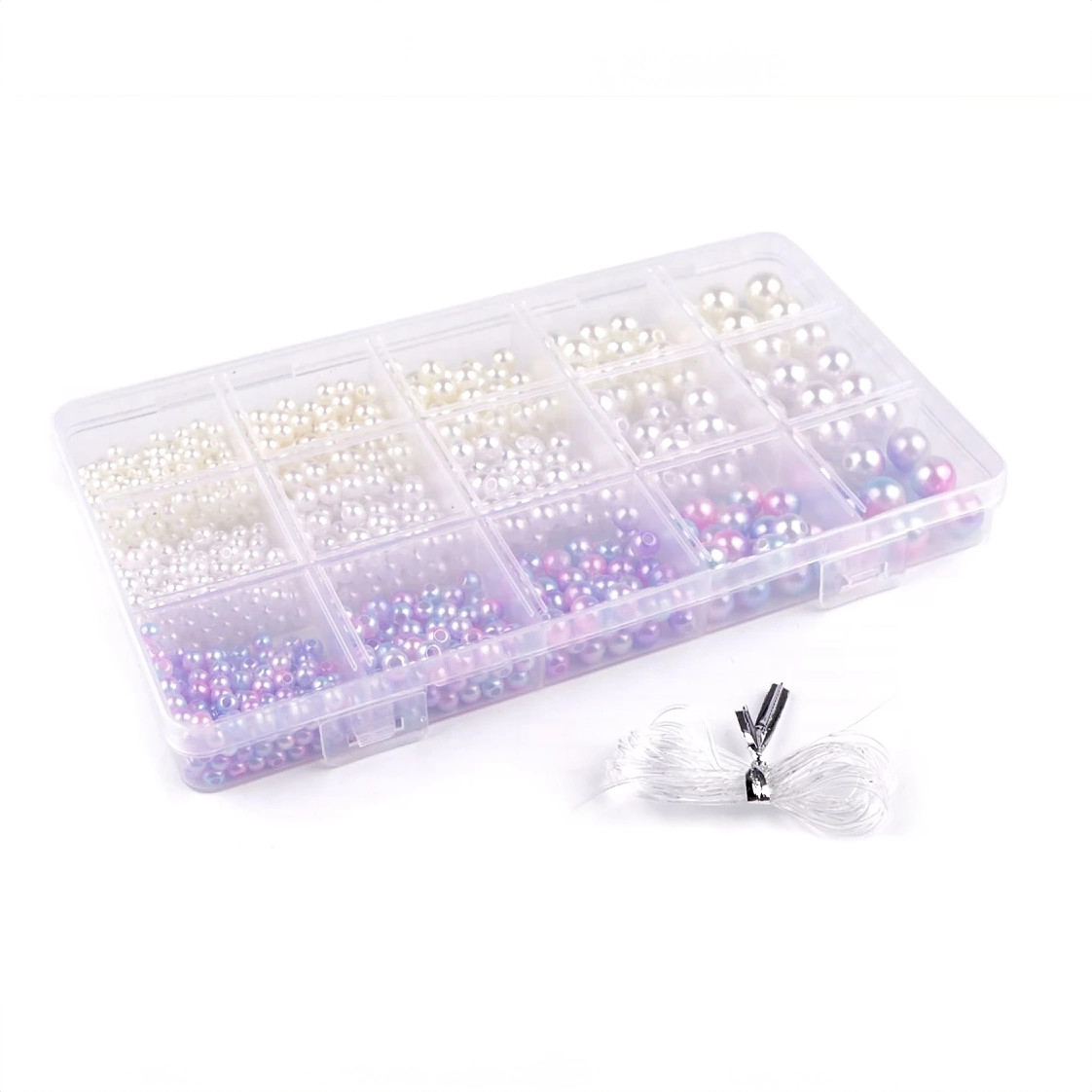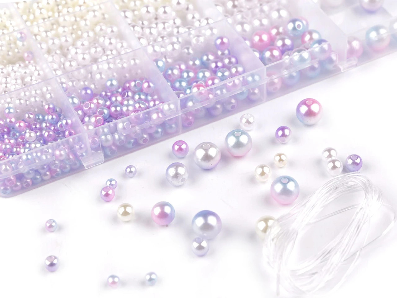 The plastic box contains a mix of plastic pearls and a silicone rubber band for stringing . In it you will find beads of white and pearl colour, with a pink - blue - purple colour transition. There are 5 different sizes of each colour in the box.