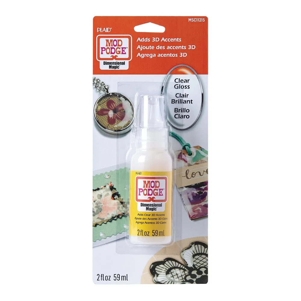 Mod Podge Dimensional Magic,Clear Gloss allows you to add dimension to your arts and crafts. This epoxy-like formula creates a faux glass-like effect that dries with a glossy finish and a 3D domed shape. Use Mod Podge Dimensional Magic to create jewelry, paper crafting, and more. The bottle features an easy-to-use writer tip - perfect for doing intricate detail work on small decoupage projects. Allow your project to dry for 24 hours for best results. This stay-put formula won't sag or run and can be used on a variety of surfaces including wood, canvas, terra cotta, and so much more. Make Mod Podge Dimensional Magic a part of your art supplies for that added touch of character and texture.
